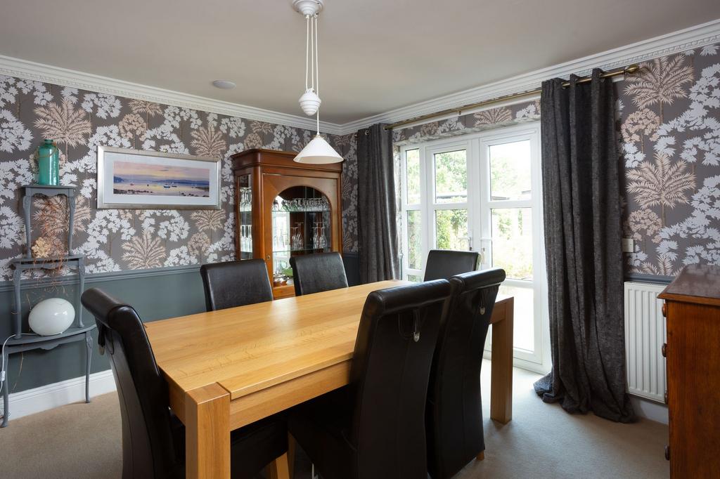 The property opens firstly to an entrance vestibule and then into a welcoming hallway off which are the principle reception rooms including the lounge to the front elevation. The lounge is generously proportioned with feature fireplace and dual aspect light. Beyond the lounge situated to the rear of the house is a formal dining room with French Doors onto the rear patio and garden.