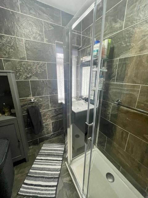 Bathroom - With two-piece suite comprising walk-in shower cubicle with handheld and rainfall shower units and a wash basin with mixer tap in vanity unit. The bathroom is fully tiled including the floor and has a uPVC double glazed window to the rear elevation.