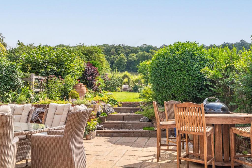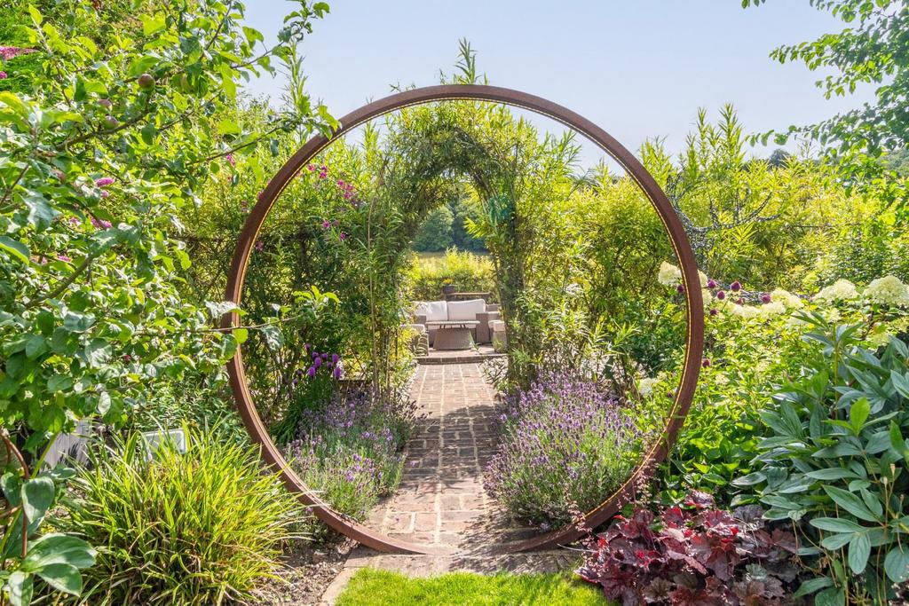 The heart of this home is the kitchen, with reclaimed Victorian tiles, an impressive Falcon range cooker, and wooden units topped with green slate worktops. A breakfasting area and garden room with French doors to the patio complete this country kitchen.