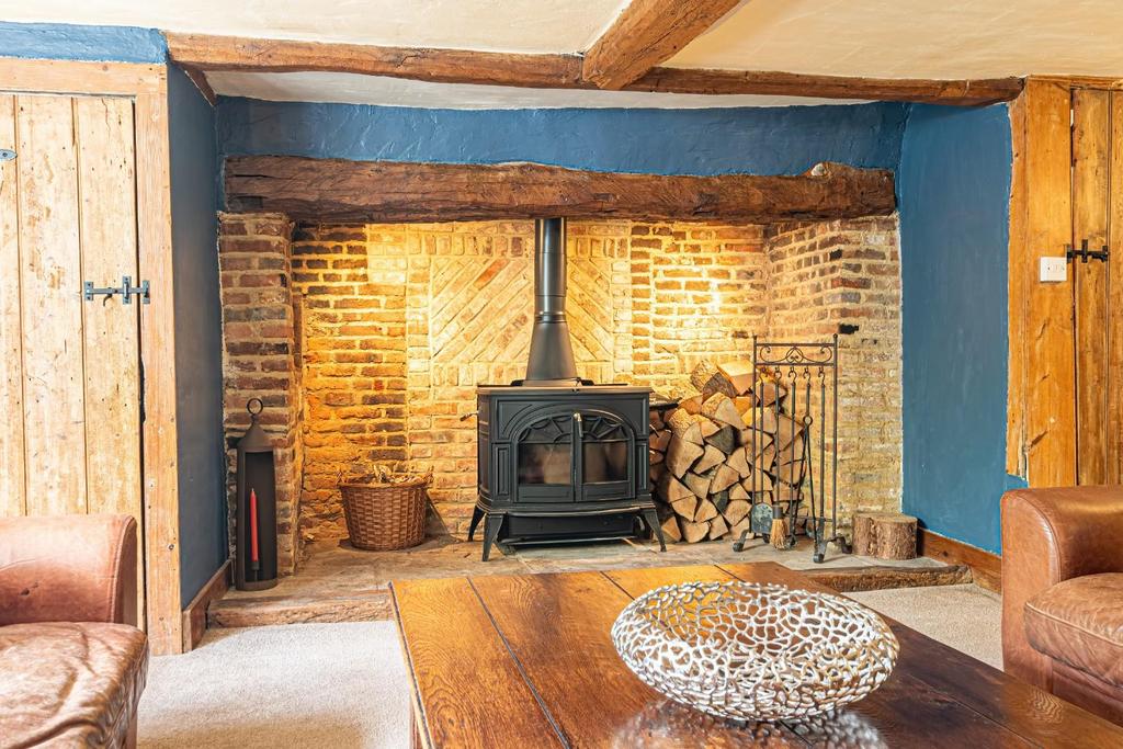 The property oozes charm and character with the original reclaimed wooden flooring from the loft, wrought iron balustrades leading to the cellar housing the tucked-away home office, a practical and stylish utility room featuring beech butcher block worktops, rich blue-painted units, and space for essential appliances. The family room showcases a stunning inglenook fireplace with a log burner, whilst there is a convenient downstairs cloakroom with a shower accessible from the garden room and entrance hallway.