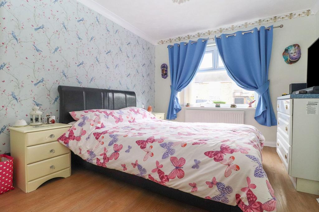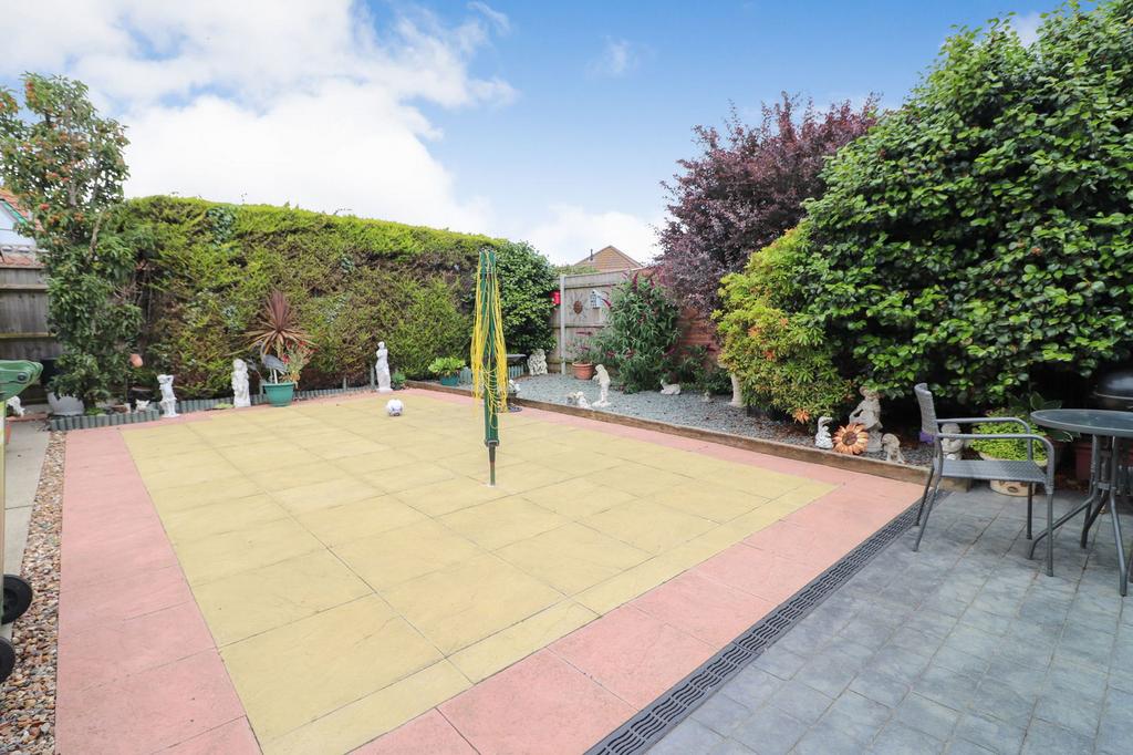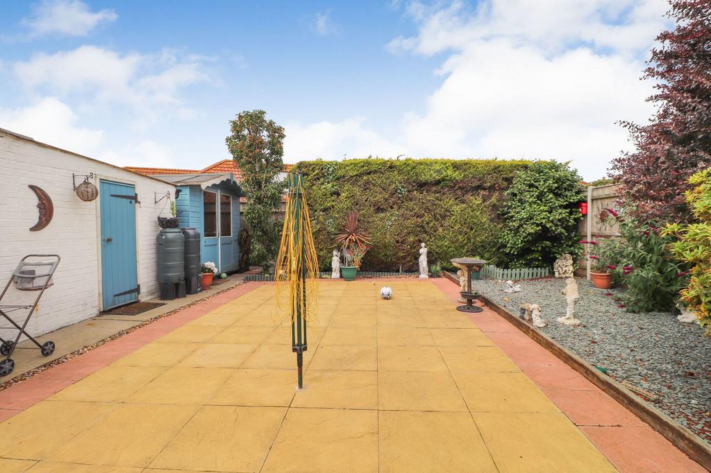 As you approach, there are gates to the front, which open and lead to the driveway, as mentioned earlier. This durable concrete driveway has been imprinted with a block-paved pattern and has a lawned garden adjacent. As you reach the rear garden, there is a low-maintenance patio at the centre with a blue stone-chipped area to one side, perfect for adding statues or potted plantings. To one corner, there is a timber shed and a range of trees, shrubbery, and plants.