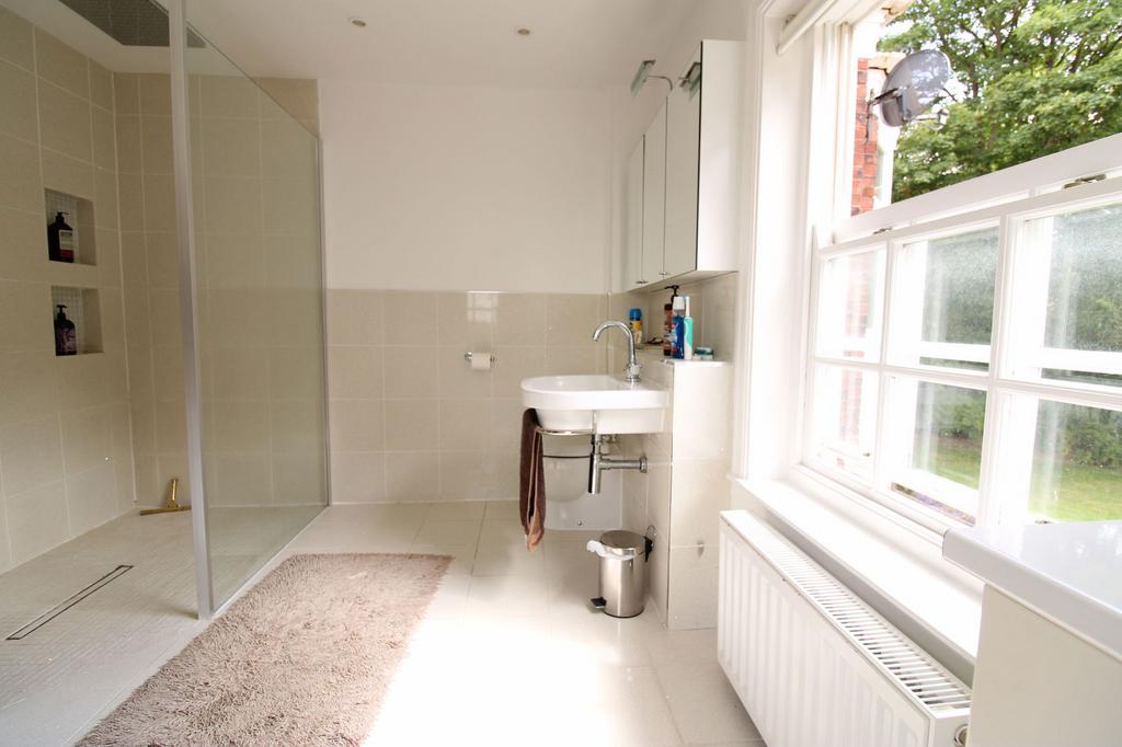 Measures approx. 3.73m x 2.83m max (12’ 3” x 9’ 3”). With matching modern contemporary suite in white comprising low flush WC, wash hand basin with chrome mixer tap and chrome rail beneath, fitted vanity furniture including dressing table top, mirror behind, pelmet lighting, a range of cupboards and shelving. Large walk-in fully tiled shower cubicle with large glazed side screen, inset ceiling spotlighting ceramic tiled floor, front and side vertical sliding sash windows both enjoying elevated views onto the gardens and the outskirts of Kirton in Lindsey and beyond.