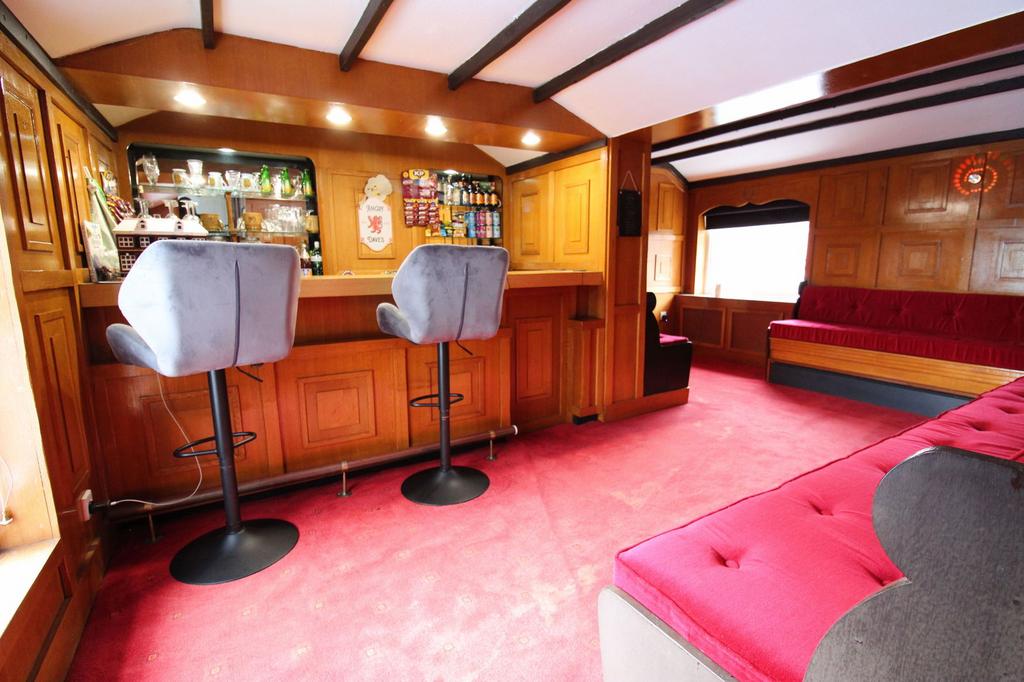 Measures approx. 5.13m x 3.76m (16’ 10” x 12’ 4”). A fantastic entertaining room with beamed ceiling, polished panelling to the walls, rear vertical sliding sash window, front multi-paned window, superb fitted bar with glass shelving behind, mirror backing with a range of cupboards, inset ceiling spotlighting above the bar top, four single wall light points and an archway leads through to: