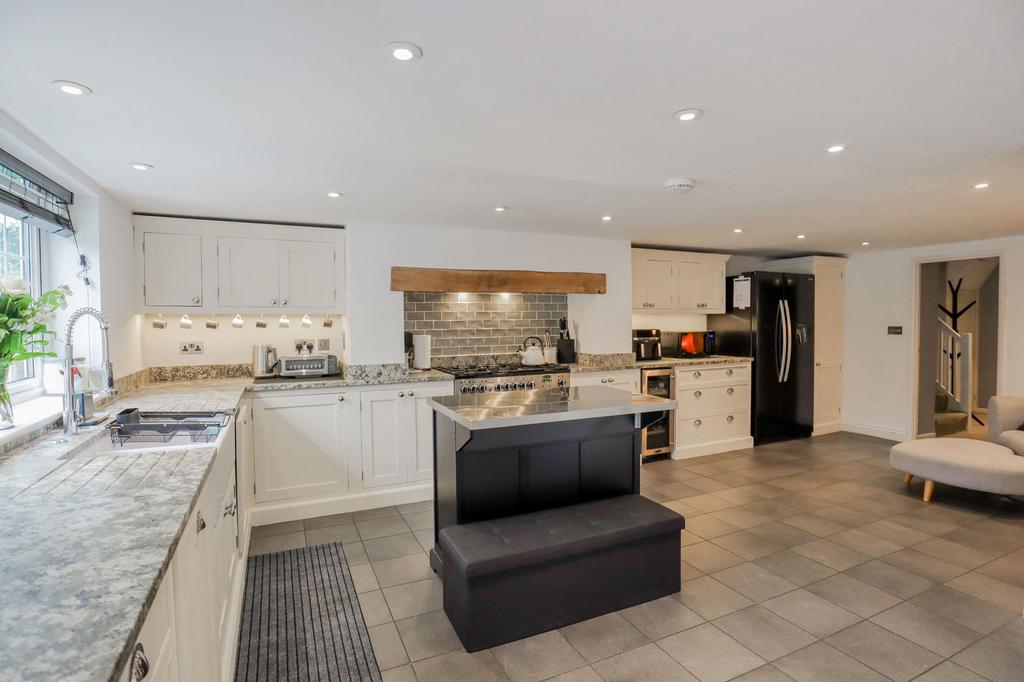 With multiple doors and windows viewing down the large rear garden. The kitchen comprises matching wall and base units with an integrated dishwasher and many storage cupboards. There is a range cooker and American style fridge freezer. A natural area allows for a very large dining table and chairs. Tiled flooring and under floor heating.