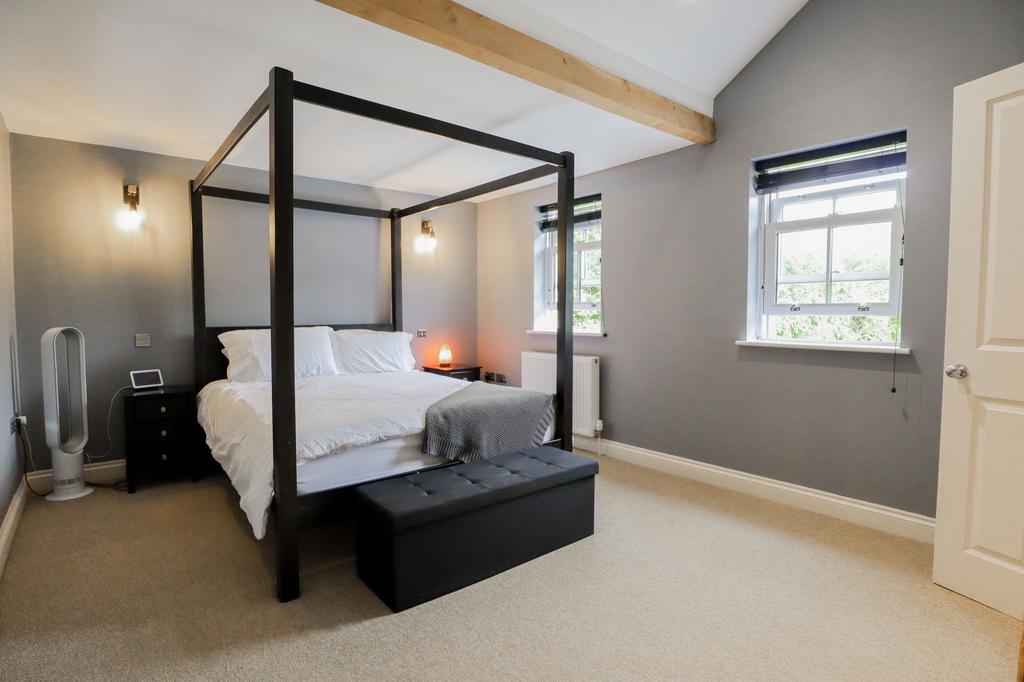 Allowing space for a king size bed and further bedroom furniture. A window views out over the large rear garden. Vaulted ceilings.