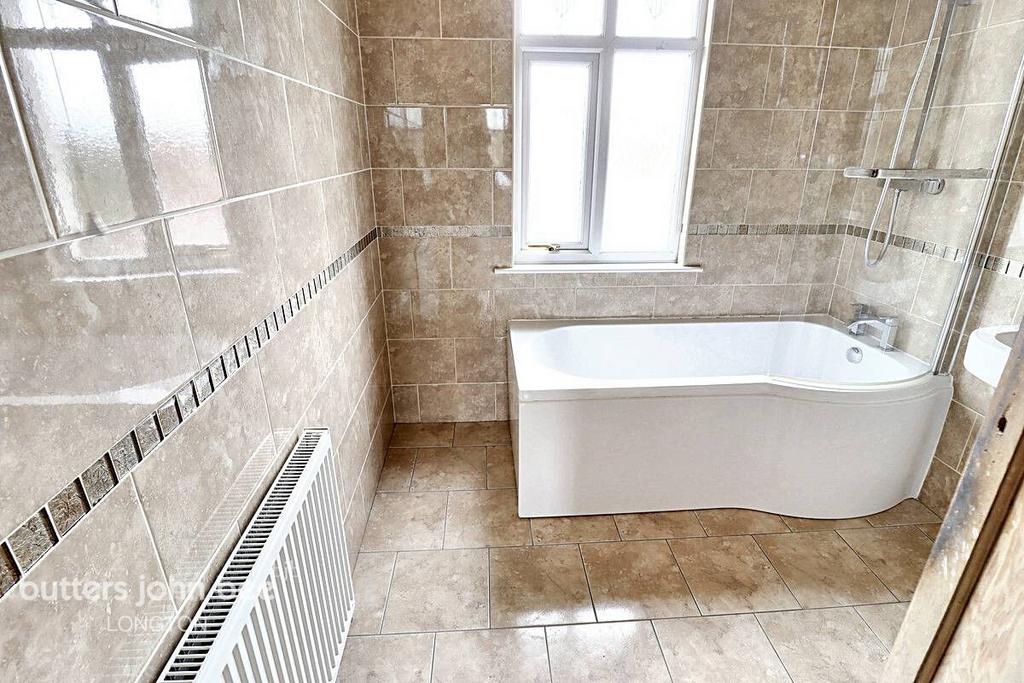Double glazed window to rear elevation, low level WC, p shaped bath with shower screen and overhead shower, wash basin, fully tiled walls and floors, radiator.