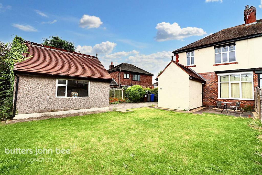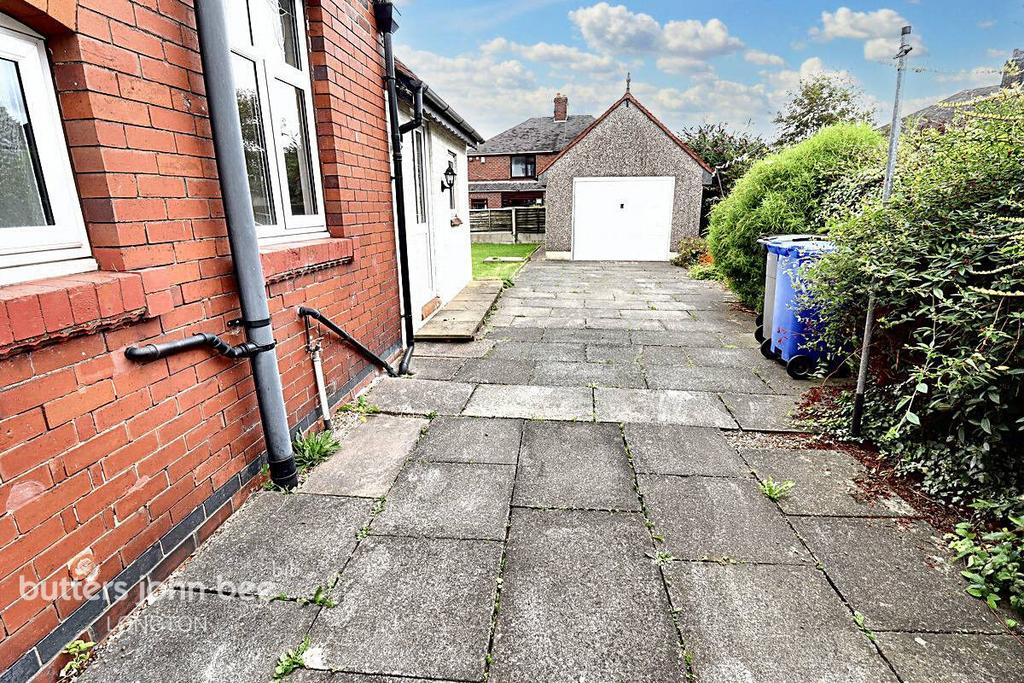 Paved driveway leading to detached garage, enclosed rear garden laid mainly to lawn.
