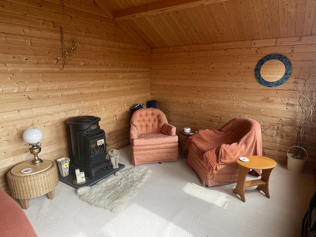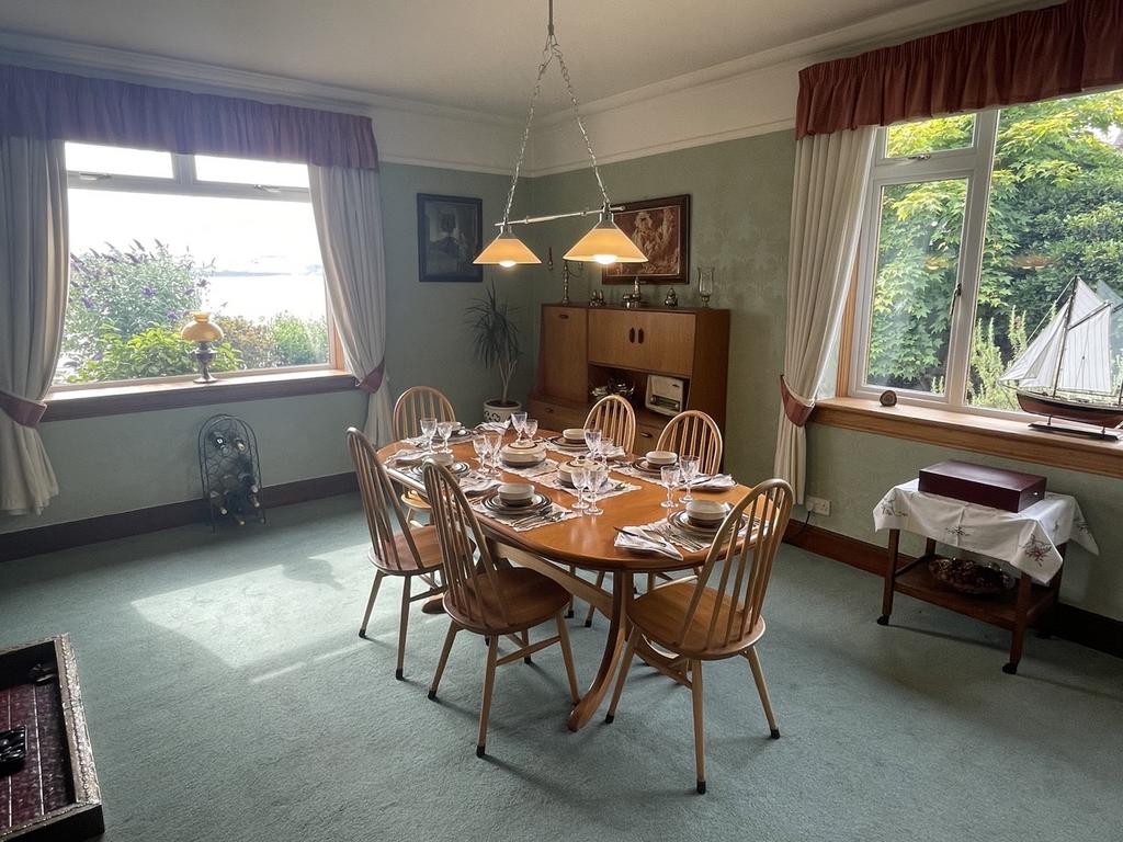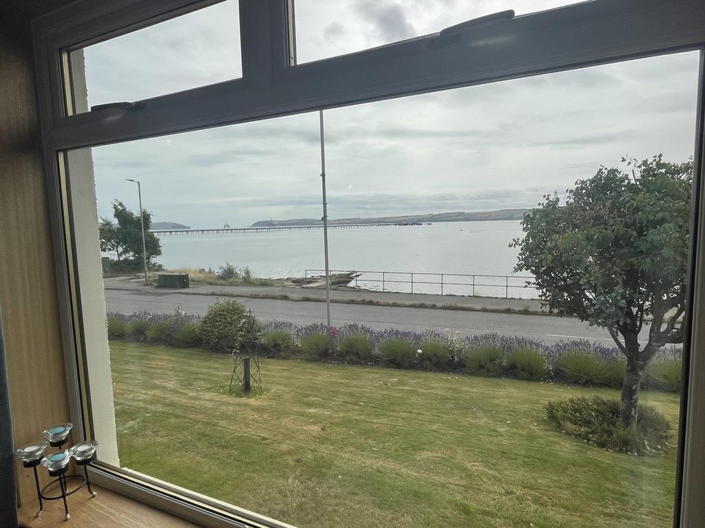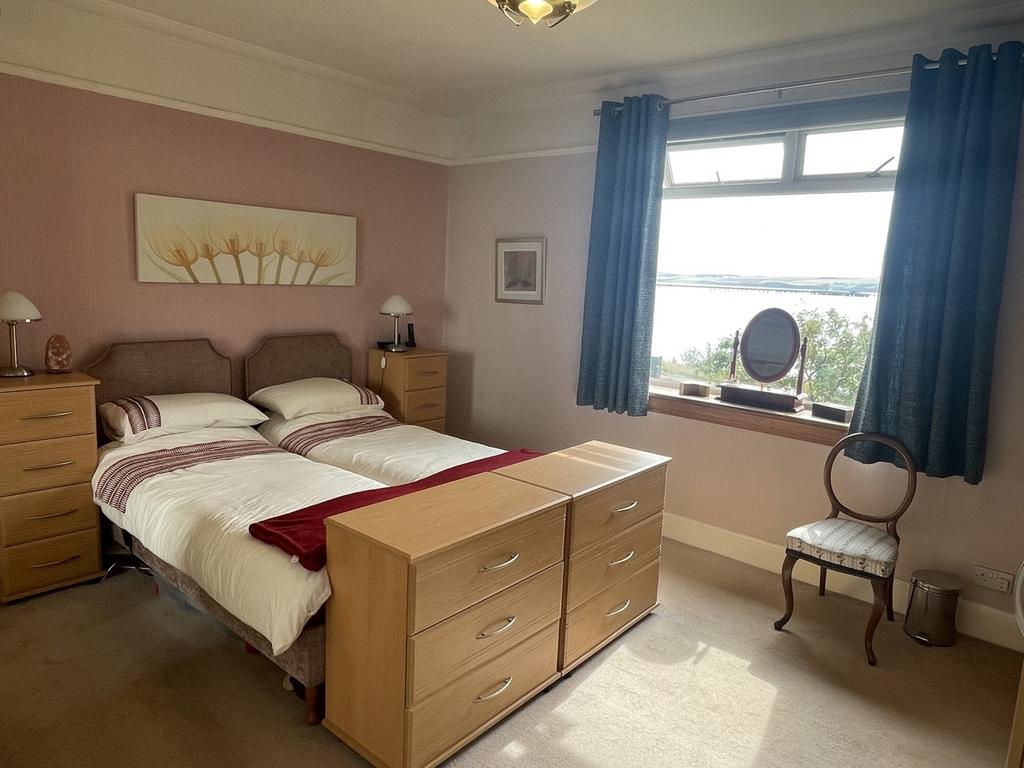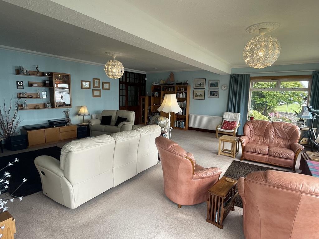 Large, bright room with excellent sea views looking over to the Black Isle. There are patio doors to the side. Multi fuel stove. Two radiators. Carpeted.
