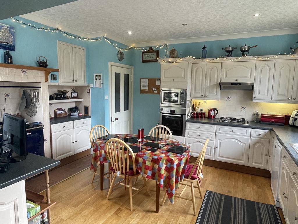 Numerous fitted wall and base units with integrated fridge, built in oven, microwave, gas hob with extractor hood above. Dishwasher. There is an gas aga. Tiled above the work tops and aga. Under unit lights. Radiator. Windows to the side and rear of the property. Just off this room is a walk in linen cupboard housing the gas boiler and also a