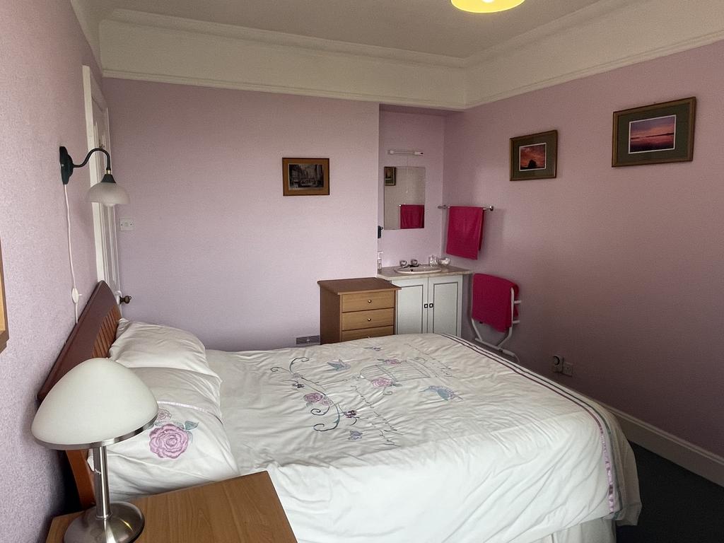 Double bedroom with vanity sink unit. Radiator. Electric heater. Window to the side of the property. Heated towel rail. Carpeted.