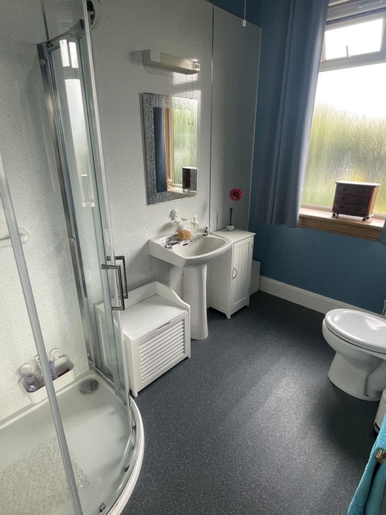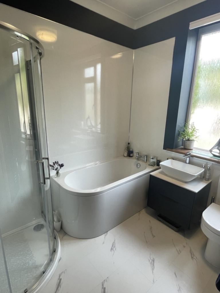 Three piece suite and separate shower cubicle. Two storage cupboards, one with access to the eaves of the