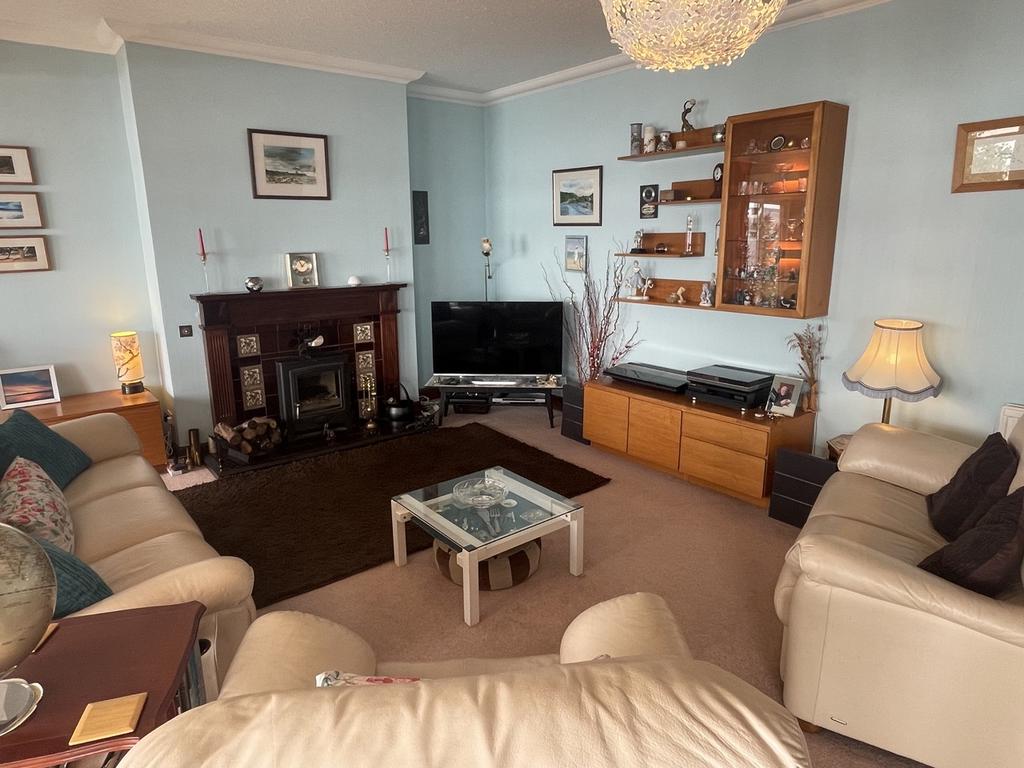 Windows to the front and side of the property with sea views. Feature fireplace with wooden surround and tiled hearth. Radiator. Carpeted.
