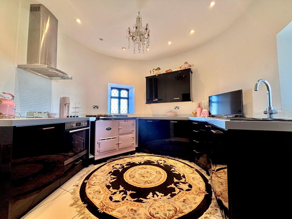 Leading through the entrance hall, the Castle features the grand Reception Room with coffered ceiling, ornate fireplace with an Esse Dragon wood burning stove and a King Arthur round table. There is a turret office/study, and the property benefits from full underground high-speed fibre. Leading up through stone arched double wooden doors there is a cloakroom with shower, the circular Kitchen with an electric AGA, electric cooker, dishwasher and integrated fridge freezer. Following through a further stone arch, a hidden storage cupboard, with a spiral staircase leading up to the First Floor with a stunning castellated Roof Terrace, which is a unique sun trap, suitable to relax and ideal for outdoor entertaining. Completing this level is a third bedroom.