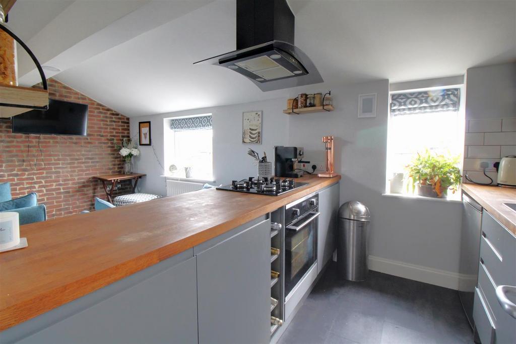 Kitchen - The well present modern grey matt kitchen with attractive wooden counter worktop offers ample storage space, wine rack, space for appliances aswell as an integrated five ring hob and oven which looks through to the living area providing an open plan entertaining space.