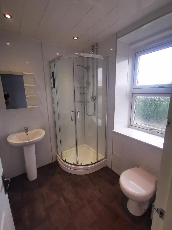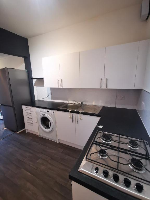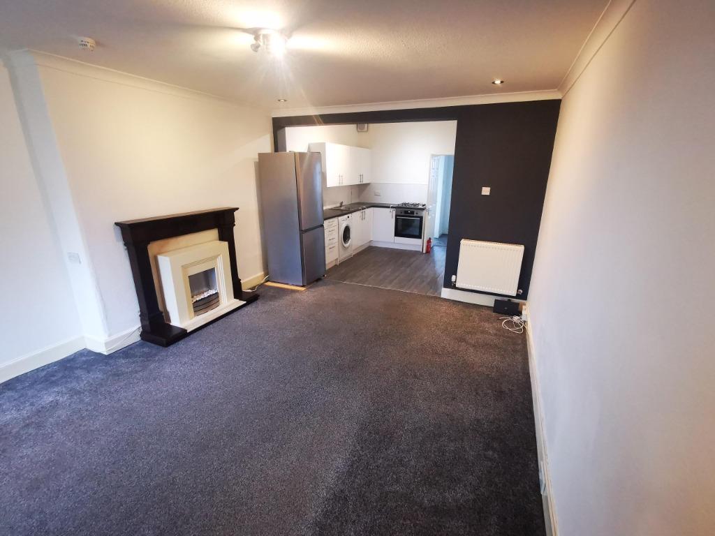 Spacious living room with south facing views, leading to modern kitchen with appliances including Zanussi oven and Indesit gas hob, washing machine and Haier fridge/freezer, two double bedrooms and contemporary shower room