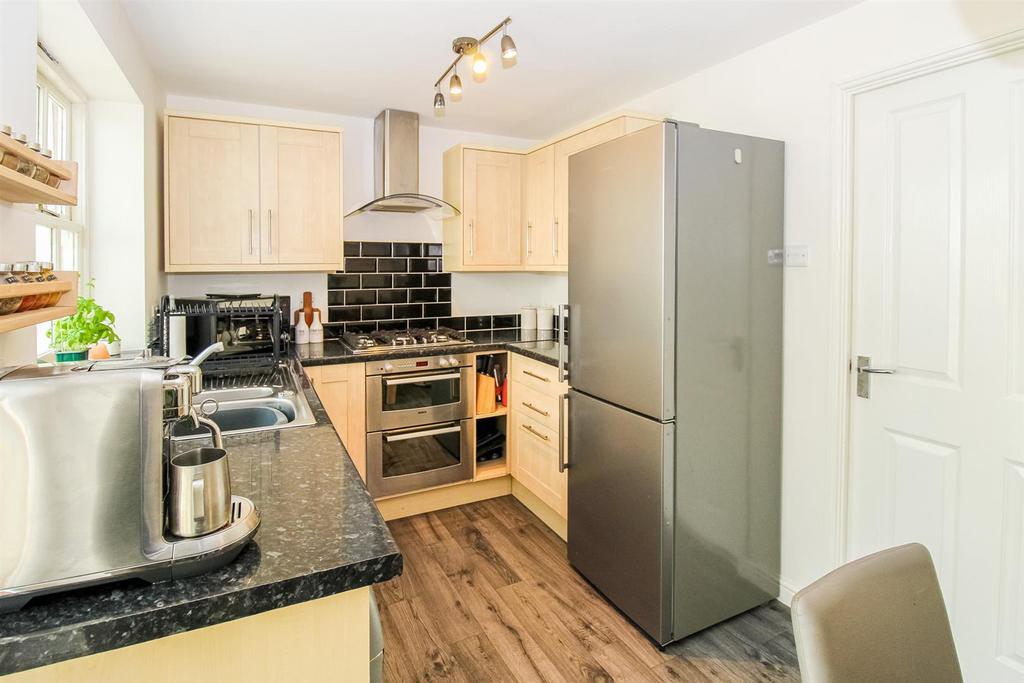 Kitchen - 3.94m x 2.35m (12'11" x 7'8") - Wood framed single glazed window to the rear elevation and wood framed door leading to the conservatory. Modern fitted kitchen with an array of wooden wall and base units for storage with black laminate work tops, integrated oven with five ring gas hob and cooker hood over with partial tiled splash back. Stainless steel sink and drainer unit with mixer tap, space for a washing machine and fridge freezer. Central heating radiator.