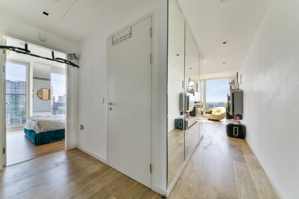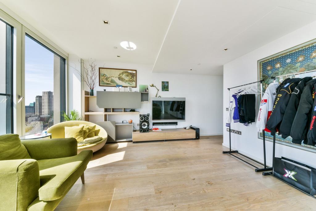The apartment features an impressive fully fitted kitchen, with an open-plan reception room designed to entertain, offering southwest views of famous London landmarks. The reception is bathed in natural light through the floor-to-ceiling windows, enhancing the apartment’s airy feel. The fully fitted bathroom is finished to an excellent standard, while both bedrooms offer ample storage, which is a theme throughout the apartment, making smart use of the available space. Underground parking is available by separate negotiation.
