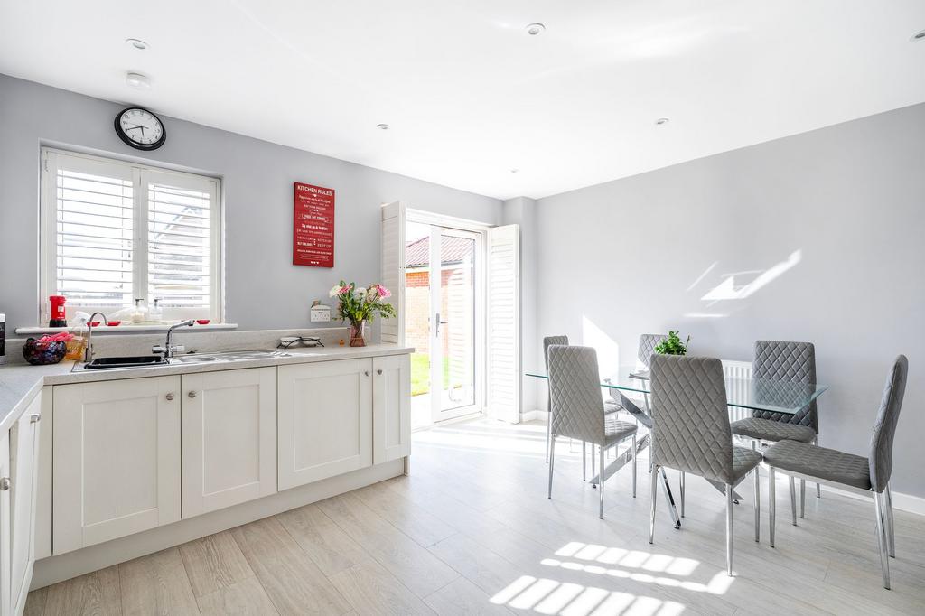 At the heart of the home lies an incredible open-plan kitchen/breakfast room, ensuring effortless interaction when hosting occasions and everyday family living. Well-equipped with high quality units and appliances to enhance your cooking experience. Offering ample amount of storage and counter-top space for meal preparation. The French doors open onto the patio, creating a seamless flow between the indoor and outdoor spaces, perfect for your summertime hosting and entertaining.