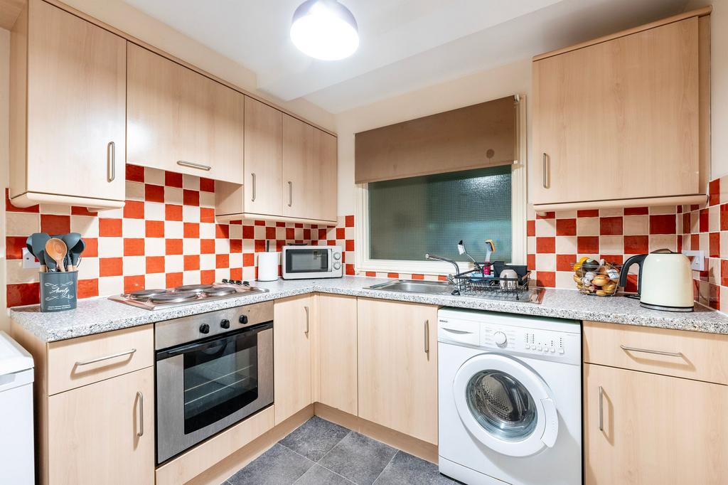 - Functional kitchen space with a good amount of storage, provison for appliances and variated tiled backsplash
