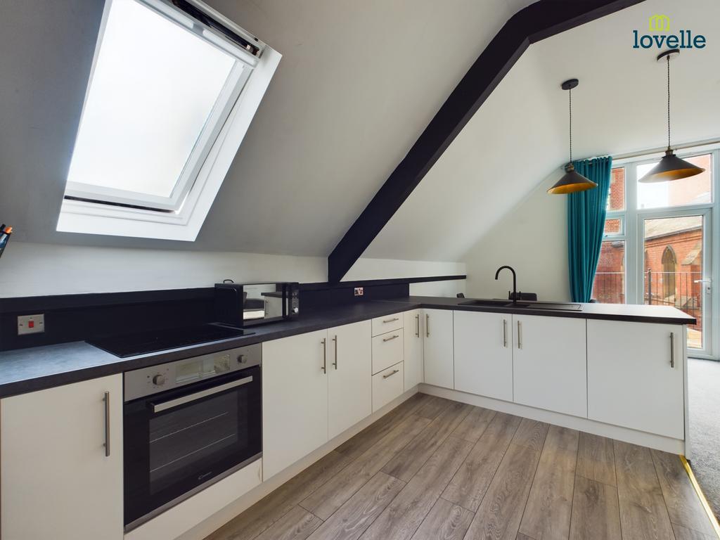 Original feature exposed beams to ceiling, feature pendant lighting, Velux style window, brand new modern kitchen with fitted base units with contrasting roll edge work surfaces, one and a half acrylic sink unit, integrated oven, induction hob, space for fridge freezer, and vinyl flooring.