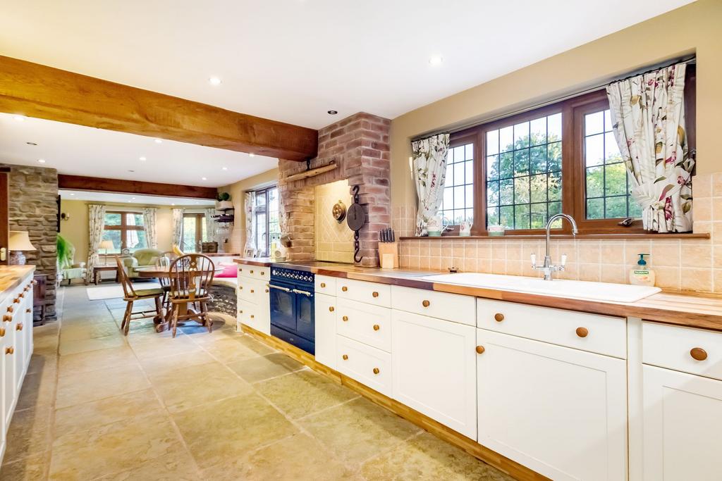 Windows to front and side, range of wall and base units with wooden worktops, Belfast sink, oil boiler, space for wine fridge, tumble-dryer and freezer, range of built-in storage cupboards, limestone flooring, loft access.