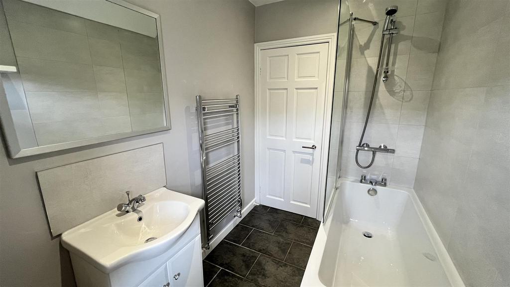 Bathroom - 2.27m x 1.67m approx. (7'5" x 5'5" approx. ) - Beautifully presented and incorporating a contemporary three piece suite, including a white bath with chrome thermostatic bar shower over, hand wash basin with chrome mixer tap set on a vanity unit and a low rise w.c. This room has been finished to an exceptionally high standard and features attractive wall tiles with complementing tiles to the floor, recessed spotlighting, chrome ladder style towel radiator, and an obscure glazed rear facing window filling the room with light.