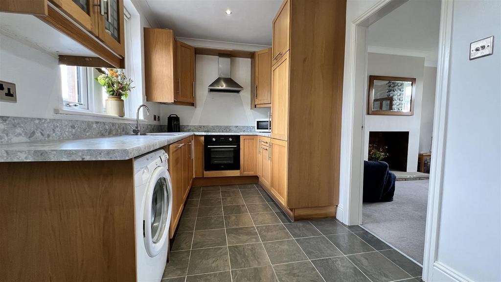 Kitchen - 4.38m x 2.26m approx. (14'4" x 7'4" approx.) - Spanning the width of the property, this well equipped modern kitchen briefly comprises of solid timber wall and base units, marble effect roll top work surfaces with matching upstand and a stainless steel sink and drainer with mixer tap over. Integrated appliances include a single electric oven with 4 ring electric hob and chrome extractor fan over, integrated dishwasher, upright fridge freezer and space for a dishwasher. The room is finished with tile effect vinyl flooring, recessed spotlights and doors lead through to the lounge, storage cupboard and outside.