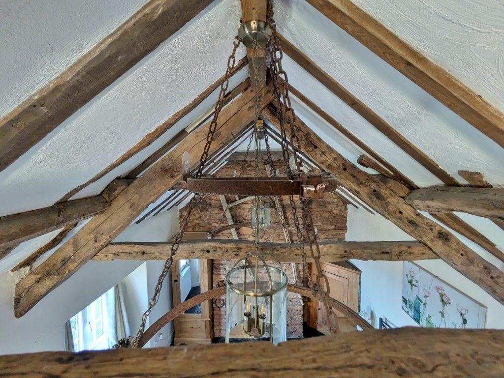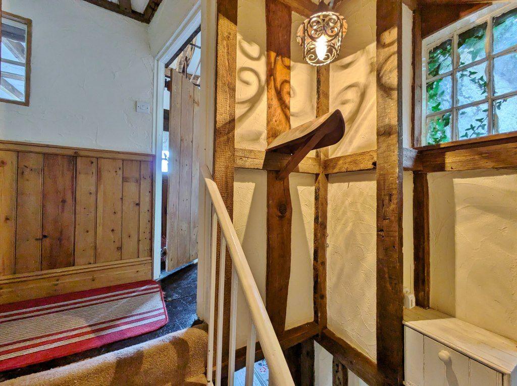 From the living room, stairs with fitted carpet rise to a half landing. Part-glazed door to the back garden. Exposed beams above the stairwell. Stairs rise again to the first floor