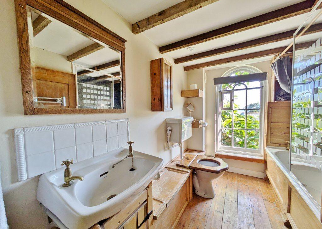 Exposed wooden floor. Window to the front with excellent sea views. Extractor unit. Panel-enclosed bath with wall-mounted electric shower. Period-style wash basin. Low-level flush WC with wooden seat. Chrome heated towel rail.