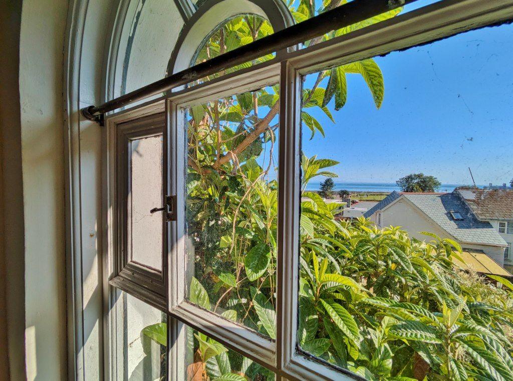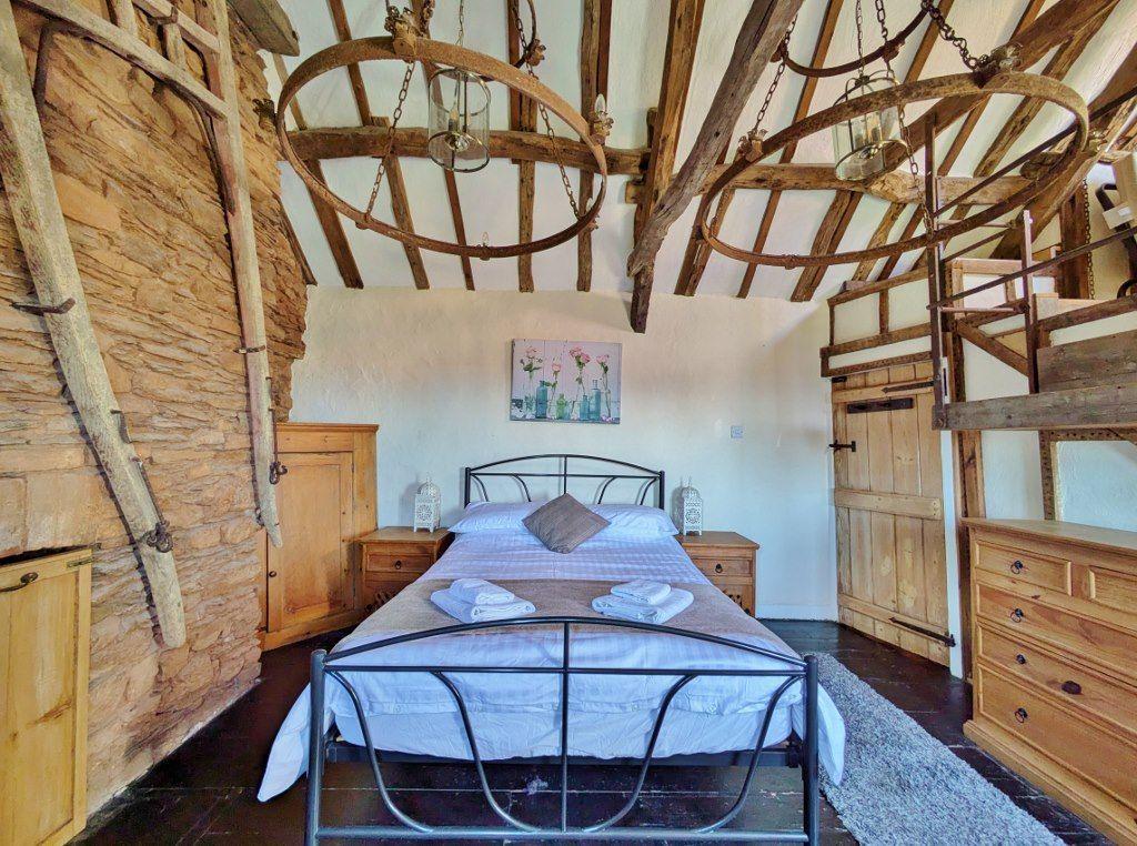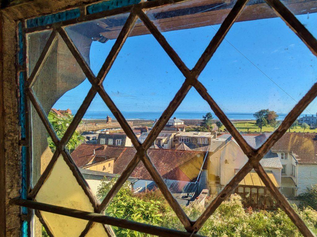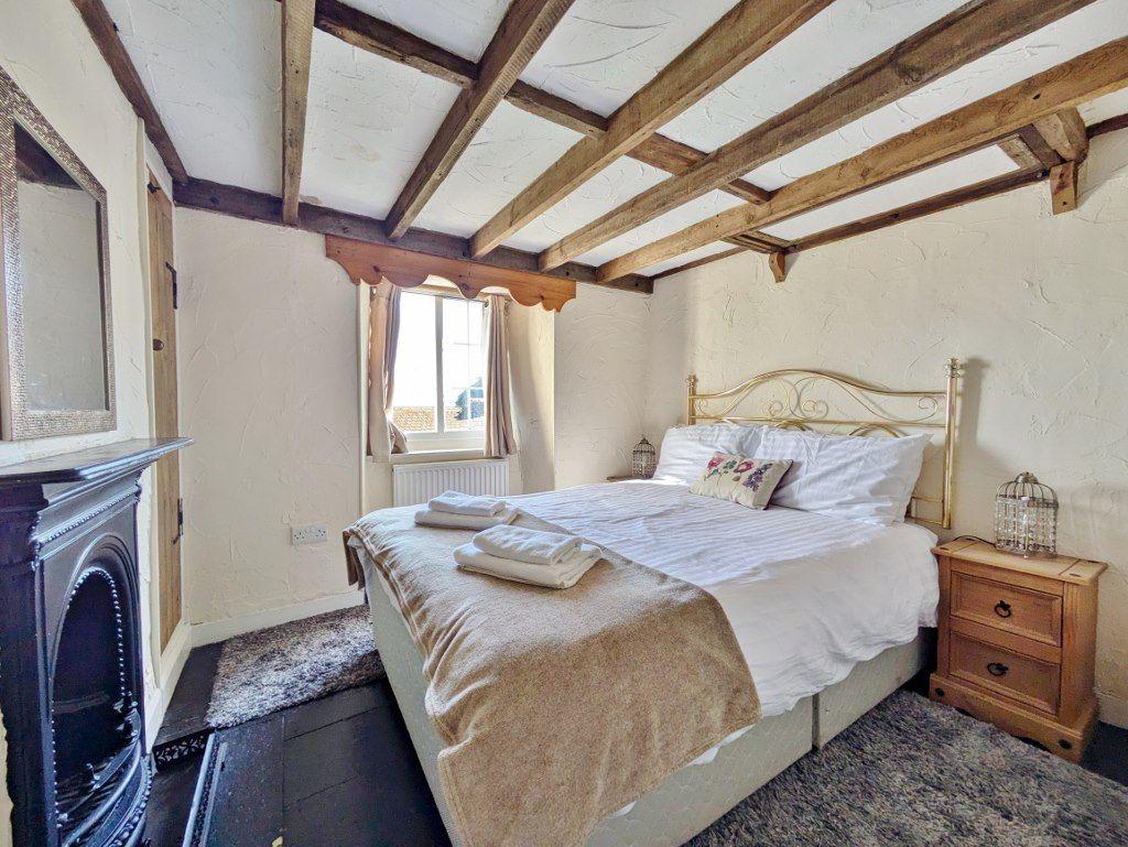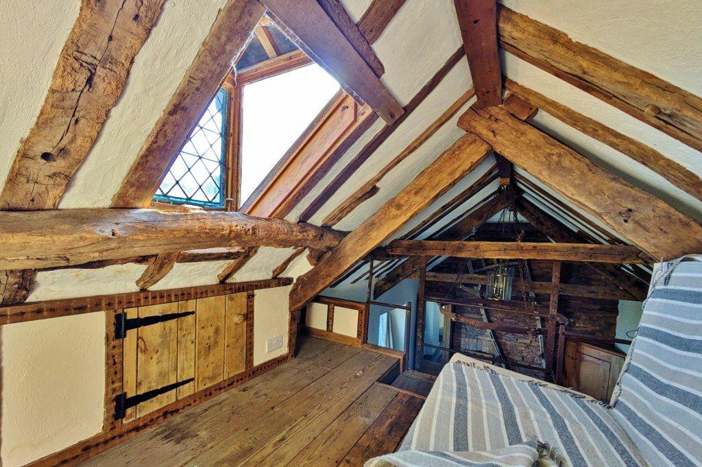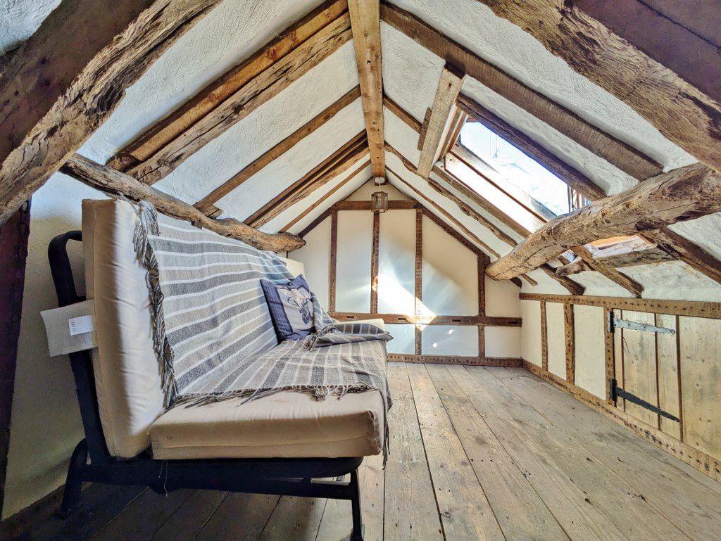 Space for two-seater sofa. Dormer window with lovely sea views. Exposed ceiling beams and trusses.