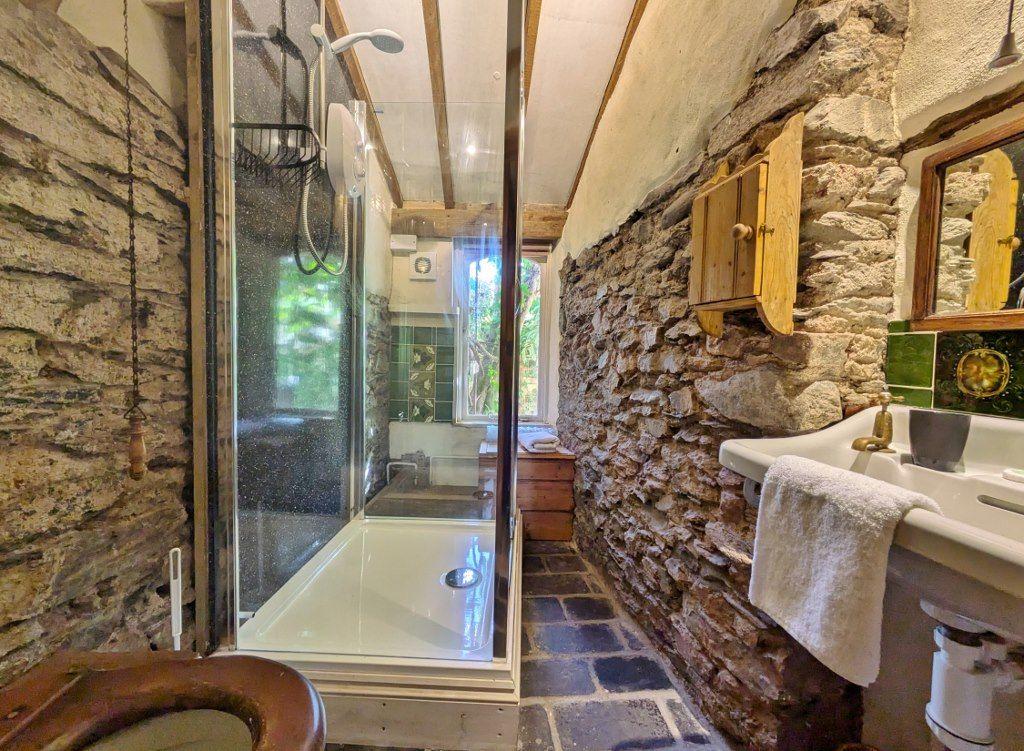 Block-paved floor. Part exposed stone walls. Shower cubicle with electric shower. Window to the front. Extractor unit. Period-style wash basin. Period-style high-level flush caste-iron WC with ceramic bowl and wooden seat.