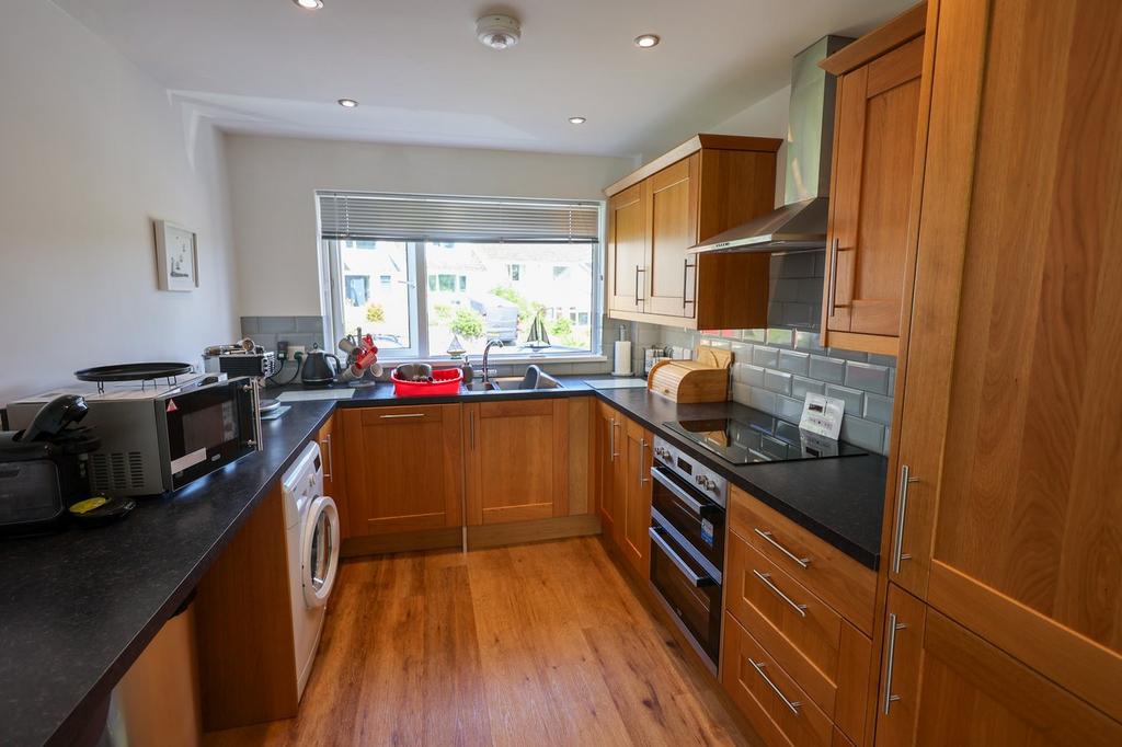 8' 5" x 10' 10" (2.57m x 3.30m) A bright and stylish kitchen featuring a large front-facing window, allowing plenty of natural light to fill the space. Designed for both functionality and style, it boasts a breakfast bar, a range of newly fitted elegant oak-fronted units with sleek square-edged worktops, and high-quality integrated appliances, including a built-in double oven, induction hob, and extractor. With space and plumbing for a washing machine and a built-in dishwasher, this well-equipped kitchen is perfect for modern living.