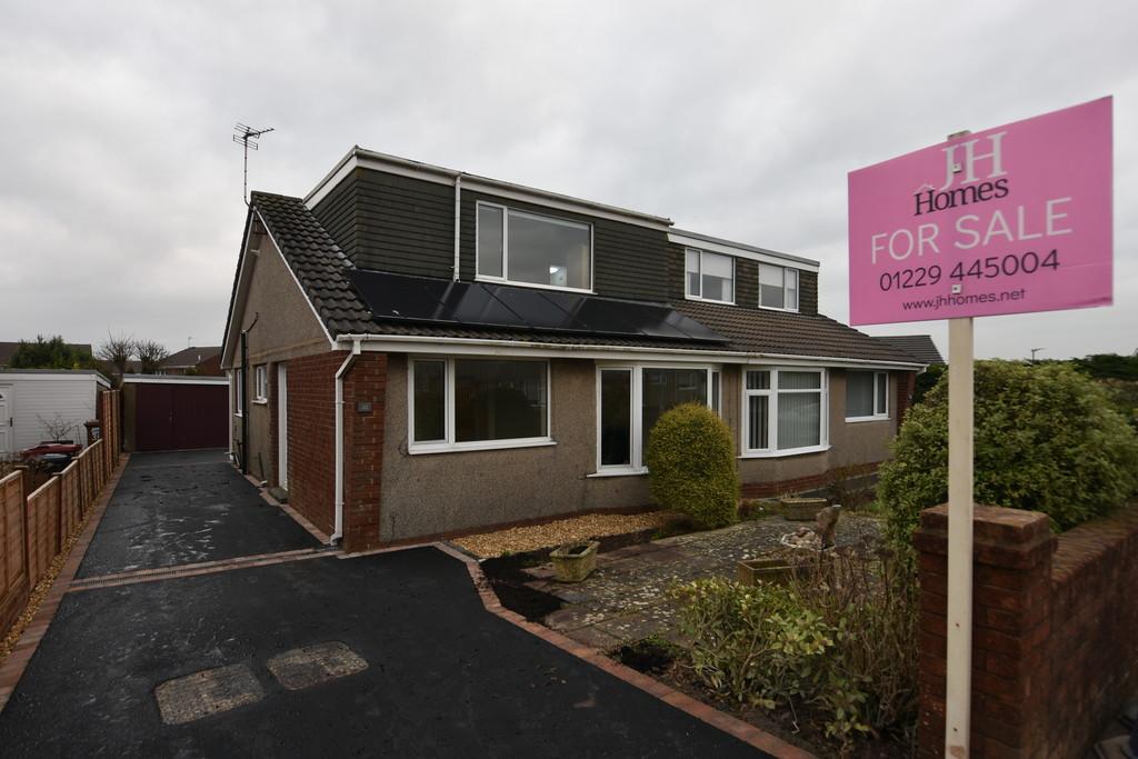 Traditional three bedroom semi detached bungalow complete with owned solar panels that feed into the grid. Having been extended to create an extra two bedrooms within roof space and is considered a comfortable family sized property situated in this popular area of Hawcoat. Recently tarmacked drive and landscaped garden along with re-cladded bathroom, uPVC double glazing, gas fired central heating system and with the advantage of garage/storage to the rear. Comprising of hallway, bay windowed lounge with adjoining dining room, fitted kitchen, double bedroom with built-in wardrobes and bathroom to the ground floor plus the two double bedrooms within the roof conversion. Enclosed, low maintenance front garden and ample sized rear garden plus the advantage of a long driveway. Offered for sale with vacant possession having no upper chain and early inspection is both invited and recommended to appreciate this comfortable home.