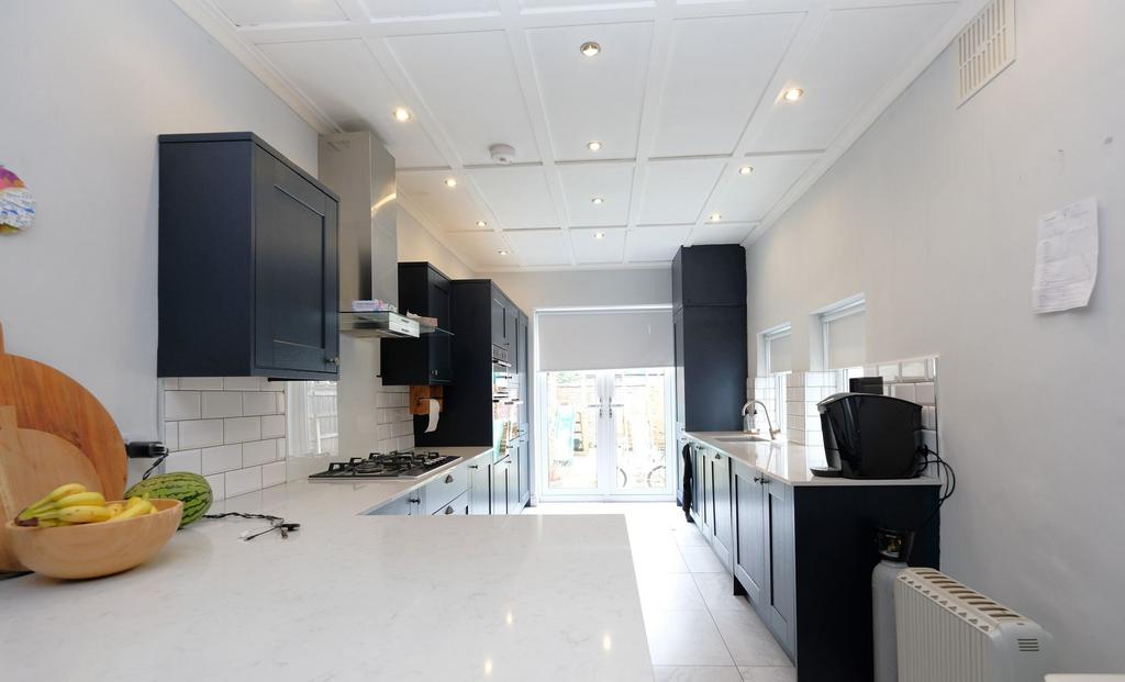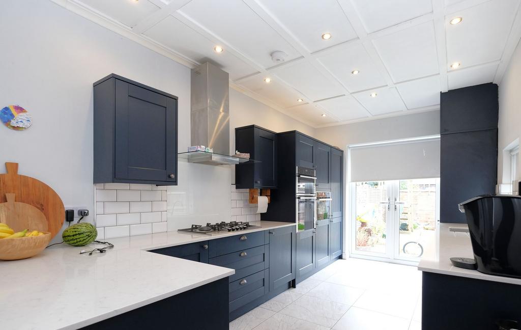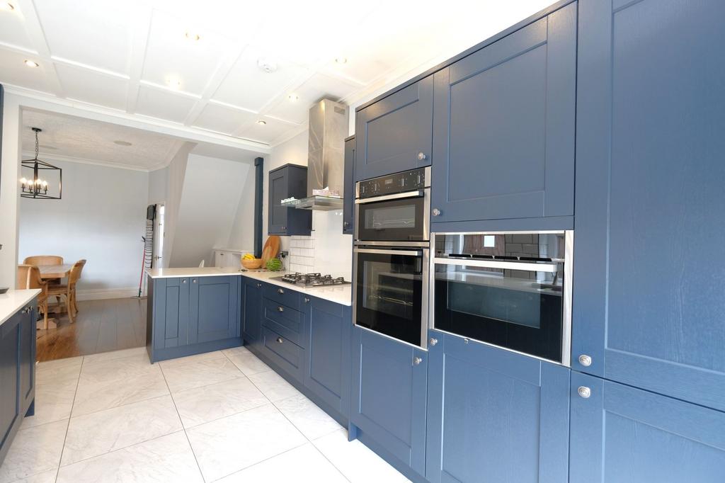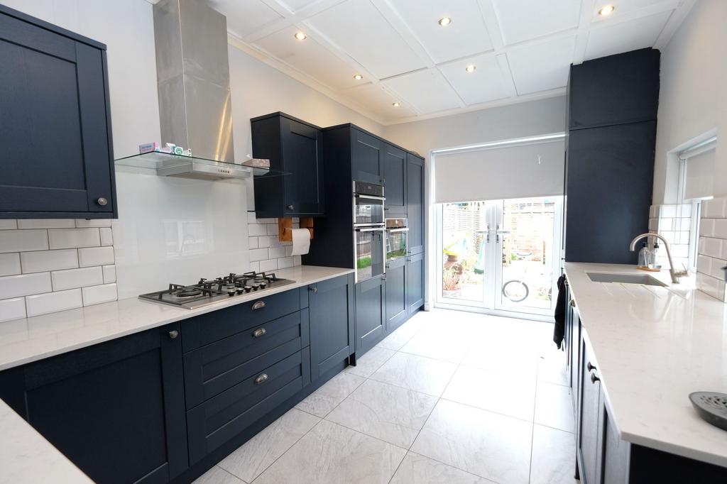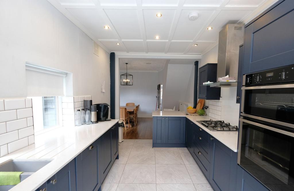 Featuring complementary wall and base units with composite sunken sink and quartz worktops. Integral fridge freezer, dishwasher, five ring gas hob, electric oven and microwave. Including a glass splashback and stainless steel extractor. Complete with ceiling spotlights, two double glazed windows and French doors. Fitted with part tiled walls and tiled flooring.