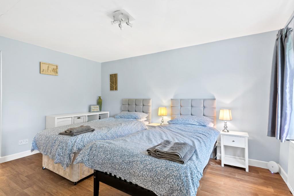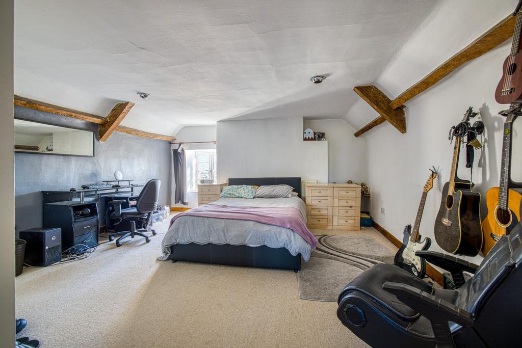 Exposed beams and a large inglenook fireplace give the room character and an electric stove creates a focal point. There is a large pantry and plenty of space for a table and chairs. A door leads to an inner hallway and on to the downstairs bedroom which has a window overlooking the front garden.