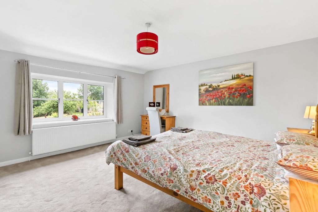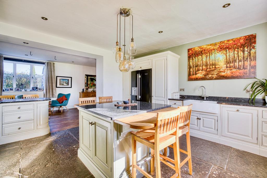The kitchen/living room is also dual-aspect and it is open-plan, adding openness and flow to the ground floor. Stylish, classic kitchen units and dark granite worksurface along with a unique central island that has two oak breakfast bars, create a wonderfully sociable working area, perfect for welcoming guests or casual dining. There are integrated appliances, including fridge/freezer, extractor and dishwasher, with over and under unit lights, double Belfast sink, and attractive pendant light over the island and a south facing window overlooking the beautiful garden. In the living area there is plenty of space for meeting, greeting and seating as well as space for dining if required.