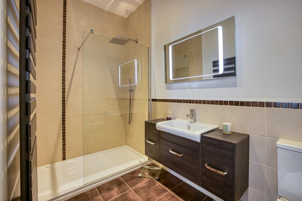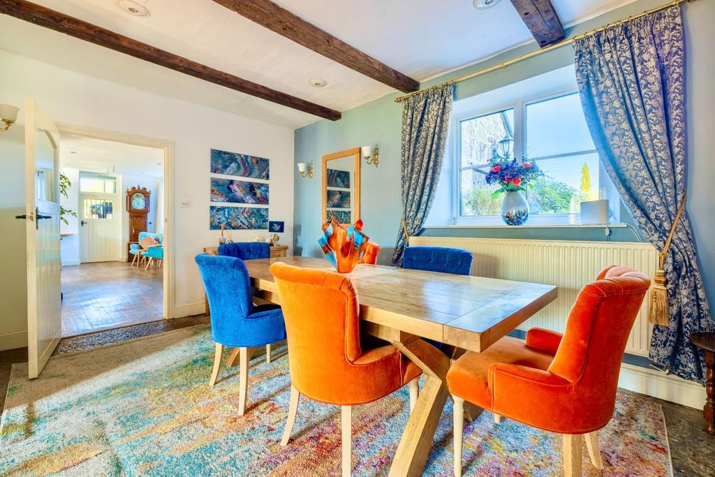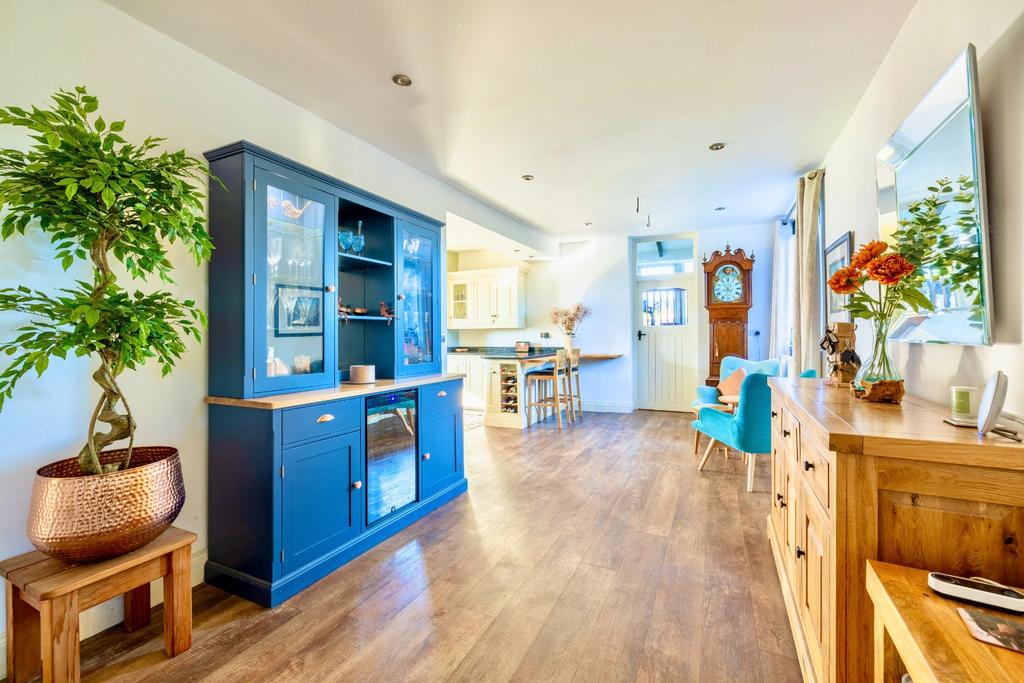 The holiday cottage adjoins the house, and it has a separate front door by the drive as well as an interconnecting door which provides access from the main house to the entrance hall of the cottage. A door leads from the hall to the kitchen/dining room, which is a stunning, bright space with access through French doors to the gorgeous, enclosed, south facing garden. Smart, contemporary kitchen units provide plenty of storage with an induction hob, extractor, integrated oven, slimline dishwasher, washing machine and space for a fridge/freezer.