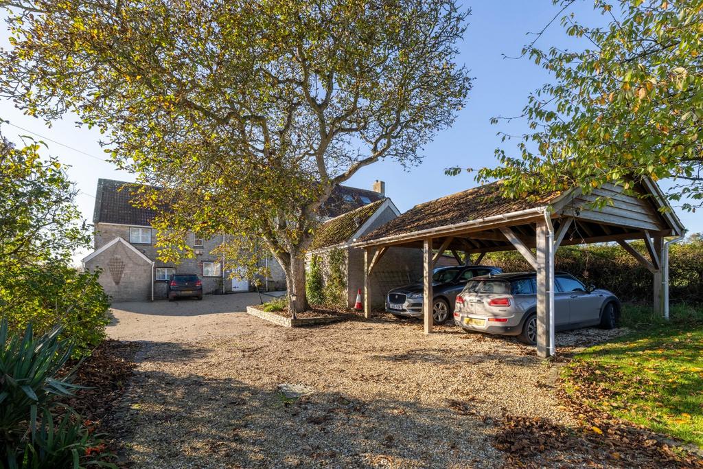 The house is approached up a new resin drive. To the right is parking on a gravel driveway and a double, timber carport.