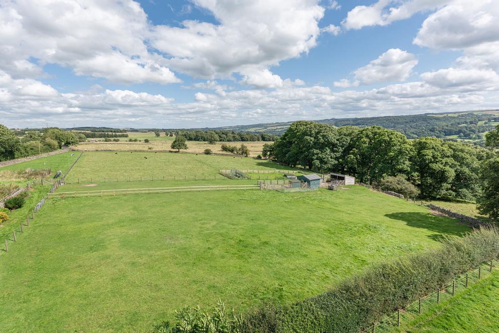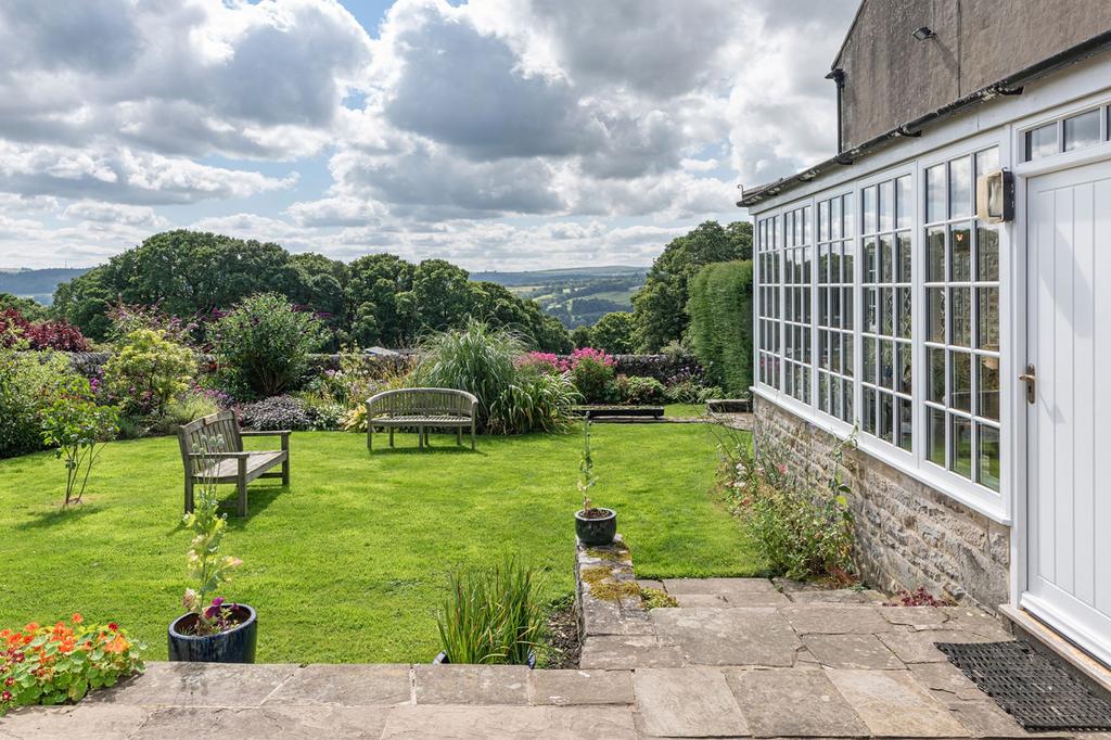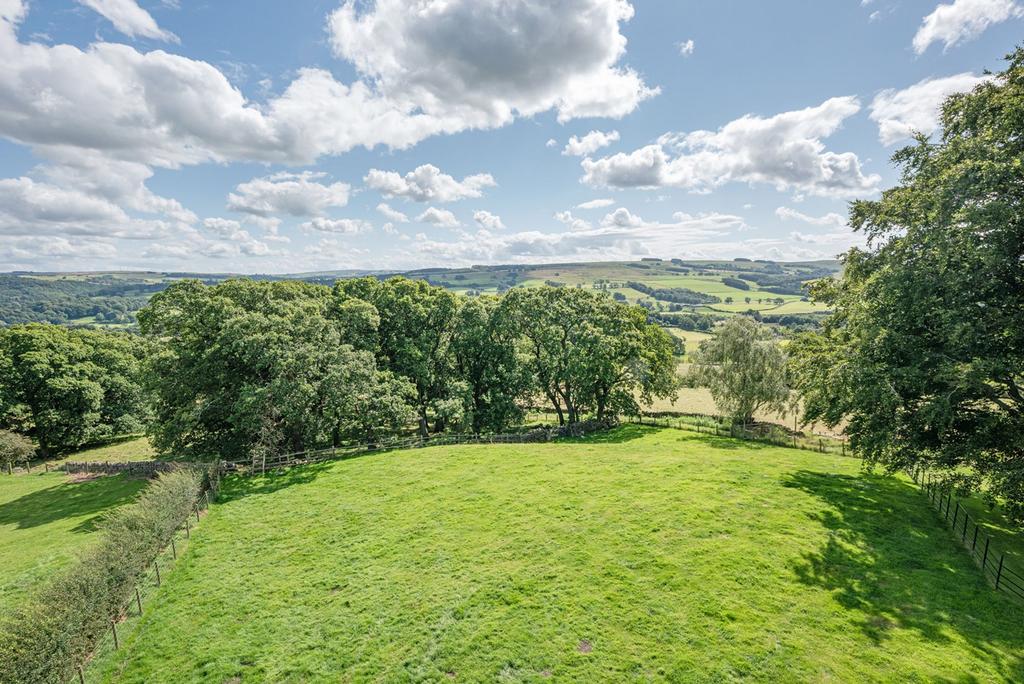 A double attached garage is situated to the side of the property, with additional hard standing for further vehicle parking. The terraced gardens, set behind stone wall boundaries, are mainly laid to lawn and offer various spots to sit and enjoy the picturesque views. A five-bar gate grants access to a sprawling area that includes both grazing land and mature woodland with large oak trees, together extending over five acres.
