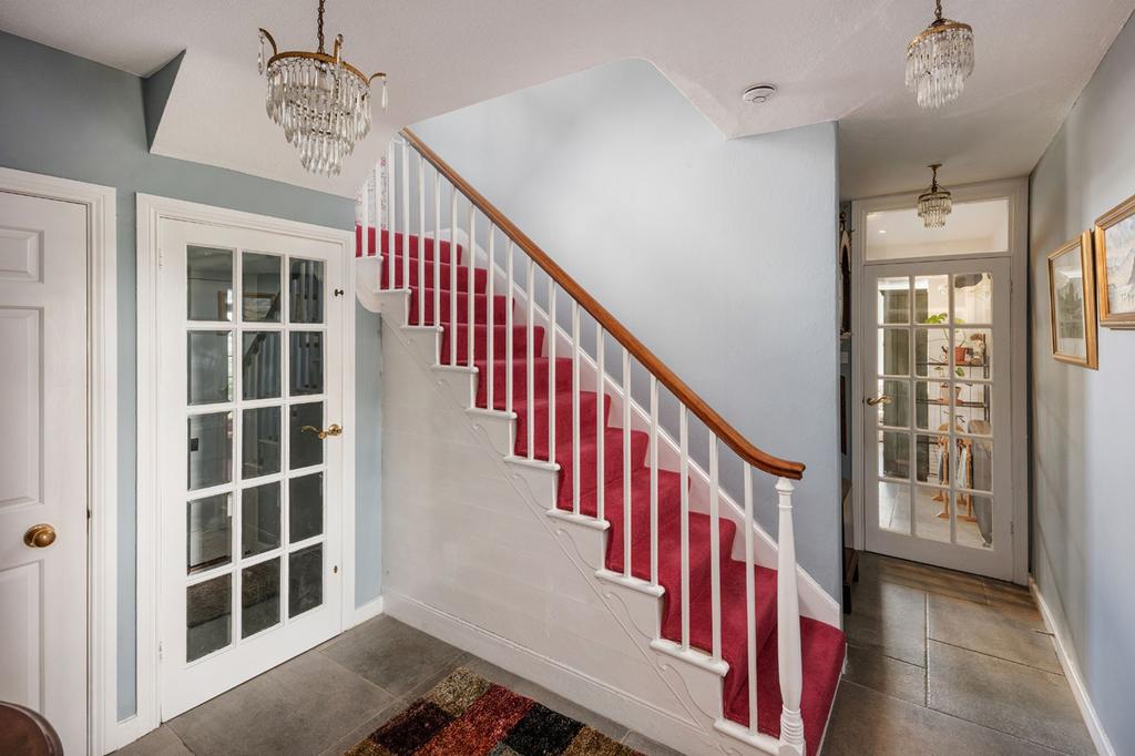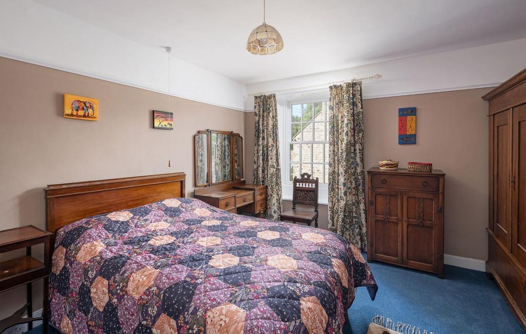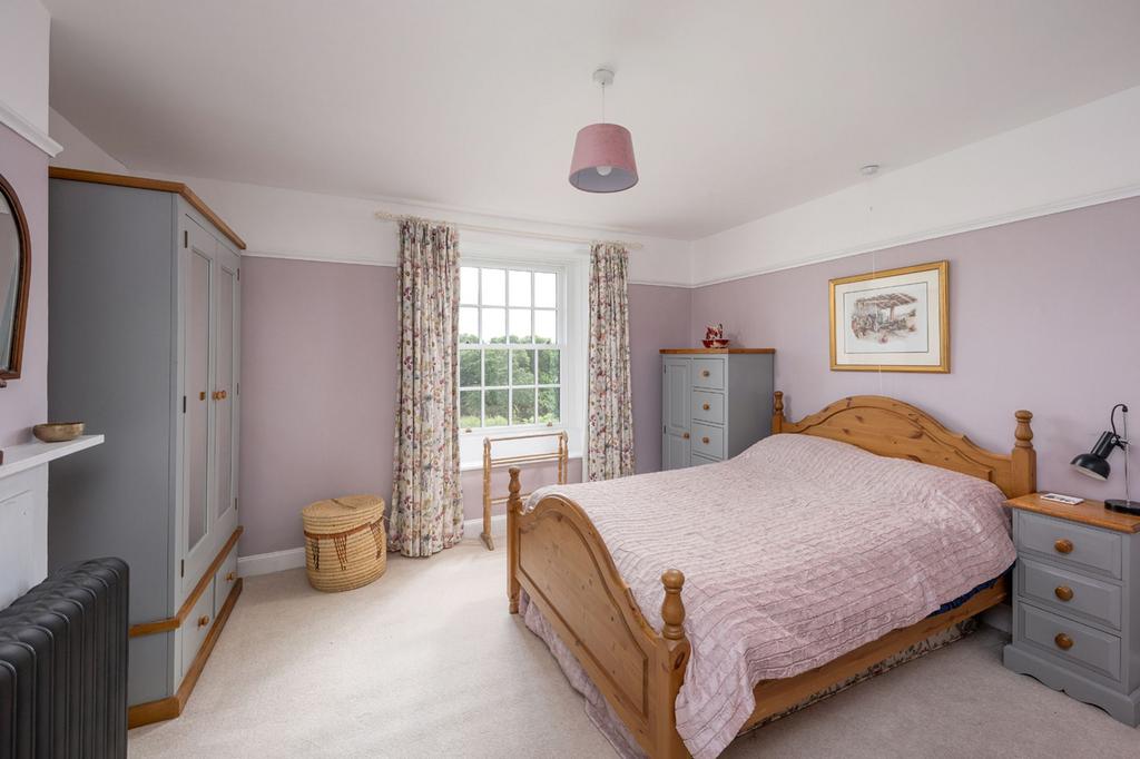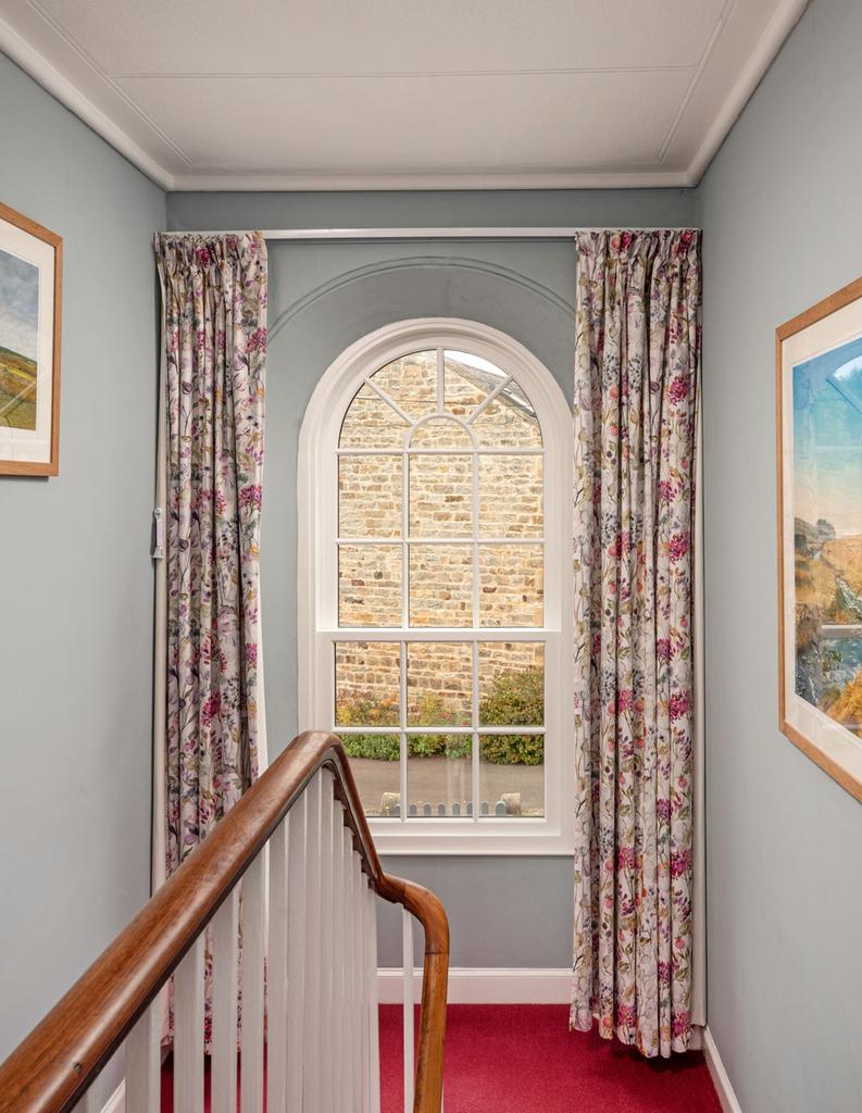 A spindled staircase with an arched window at the half-landing level leads to the upper floor, where two bedrooms are positioned at the front elevation and three at the rear. The bedrooms are served by a family bathroom, with the potential for further personalisation.