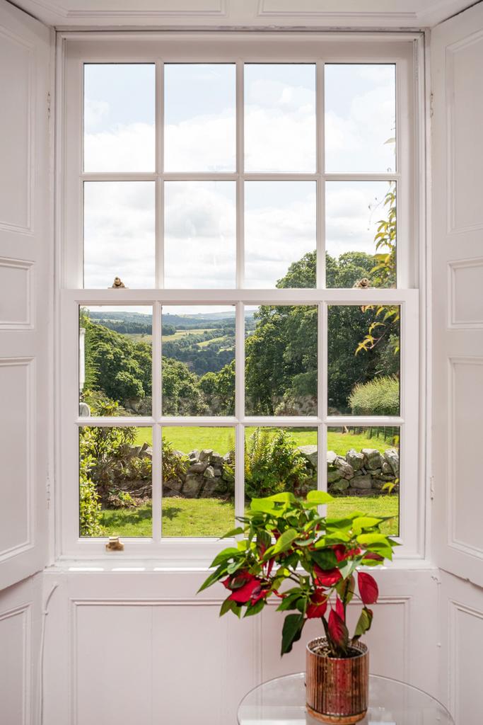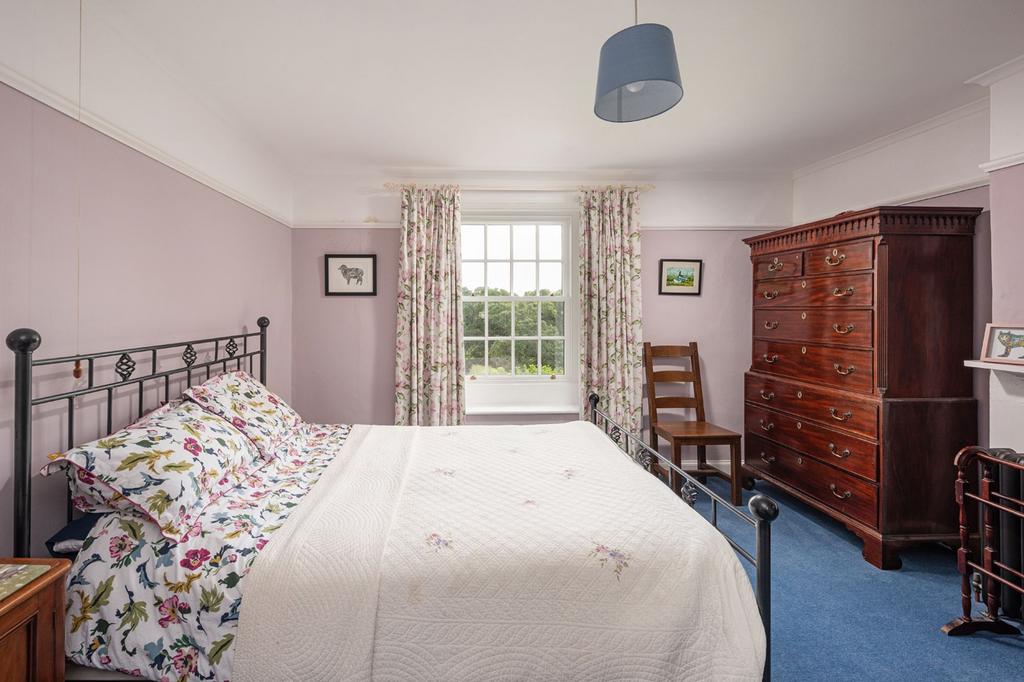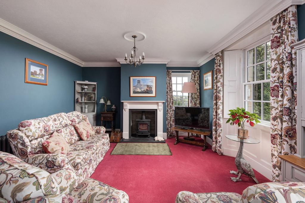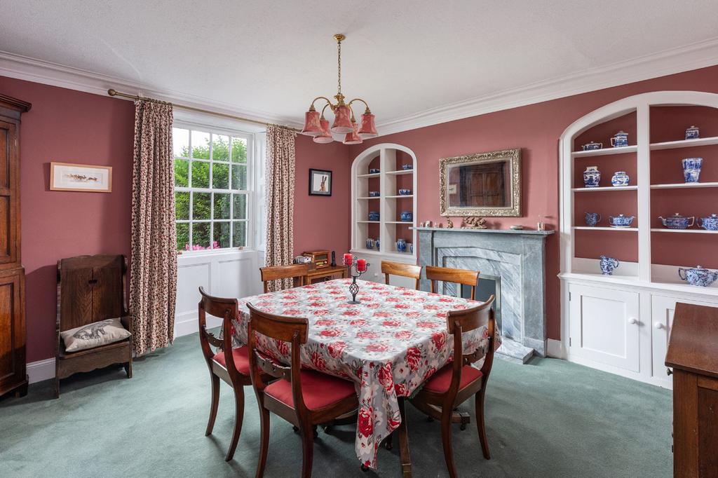 An entrance vestibule leads to the welcoming reception hallway, providing access to the main living areas. The sitting room and dining room, located at the rear, are both bright and well-proportioned, featuring original wooden shutters, marble-surround feature fireplaces, and expansive views over open countryside.