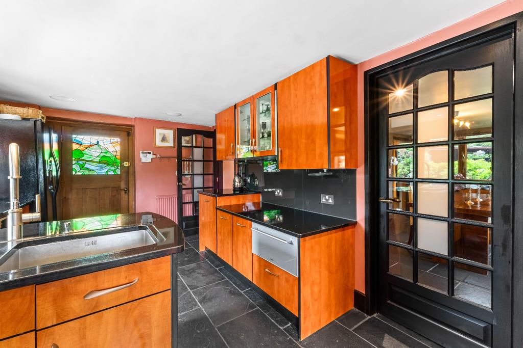 An attractive stone porch, with two recessed timber seats and space for hanging coats and storing boots, provides a sheltered entrance. From here the front door opens to the kitchen which is stylish and unique. Dark granite work surfaces combine with high gloss timber units and much thought has gone into creating an imaginative and functional workspace. All the integrated appliances are high specification Gaggenau, including a 3 ring gas hob with additional coal effect gas hot plate, extractor, steam oven, microwave, grill/oven, and separate warming draw. There is a large stainless-steel sink with half sink beside it and a separate vegetable sink with incinerator fitted.