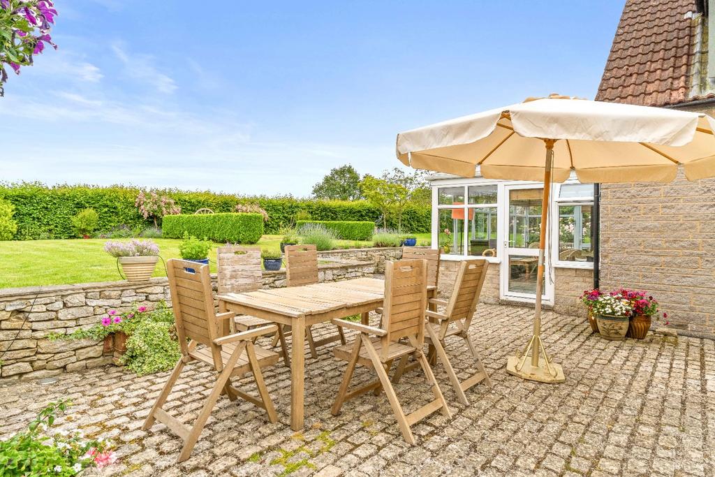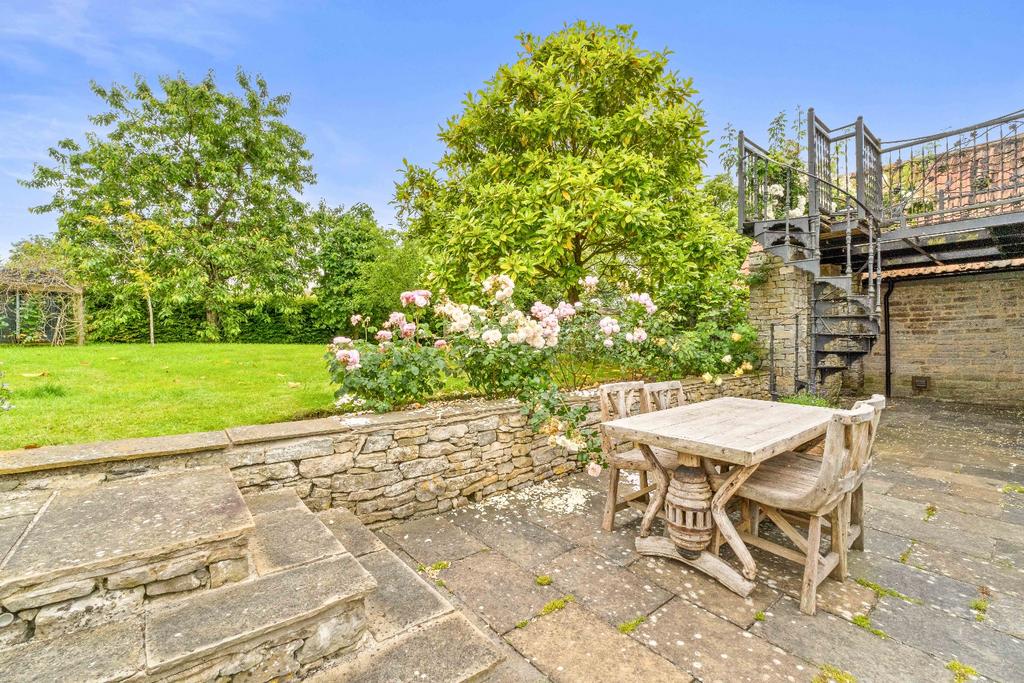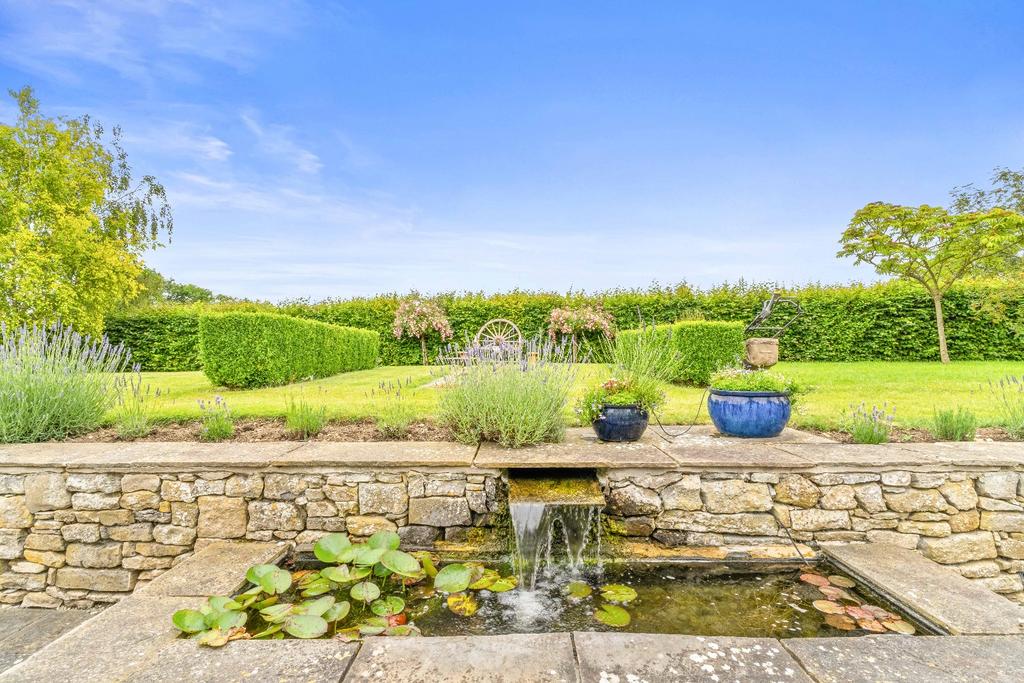 A terrace wraps around the rear of the house, past the conservatory, where there is an attractive waterfall feature, on to the southside, where the spiral stairs ascend to the balcony above. Retaining walls surround the terrace, and beyond this is lawn, mature, planted borders, fruit trees, including a mulberry, fig, apple, cherry, and various other attractive, shrubs and trees. The garden has a hornbeam hedge as a boundary.
