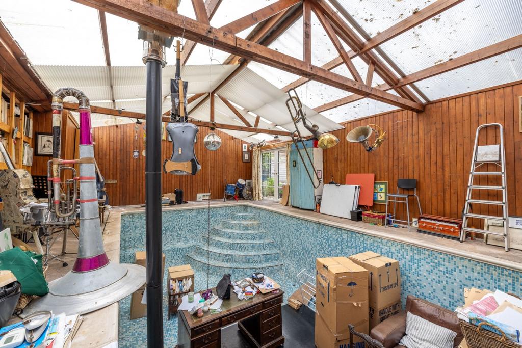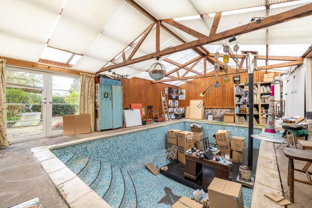 A sizable timber building with a Perspex roof. Inside there is a swimming pool with mosaic tiles and steps lead down into the pool (which is currently empty of water). A wood burning stove has been fitted creating a unique area for working or playing.