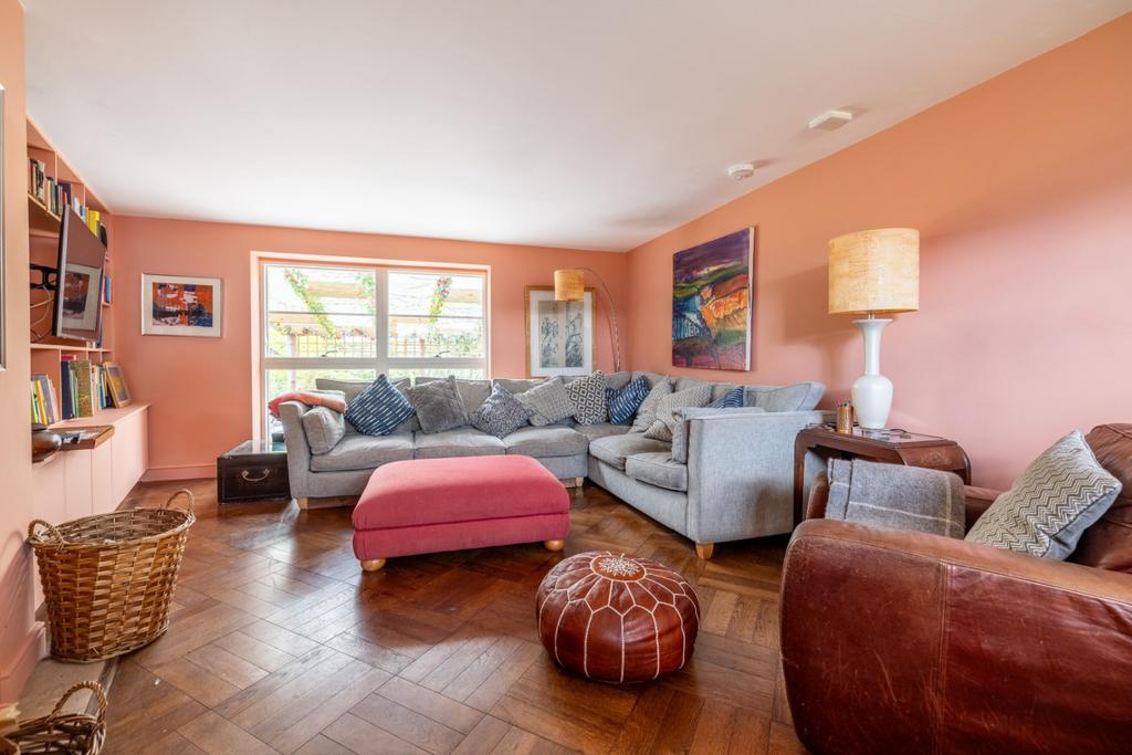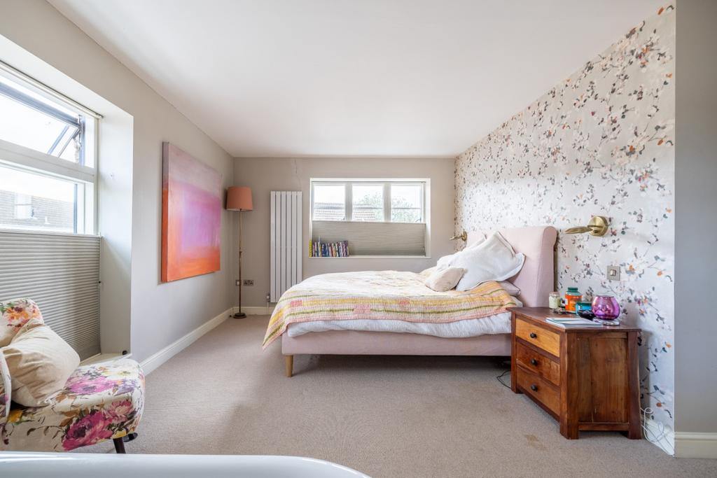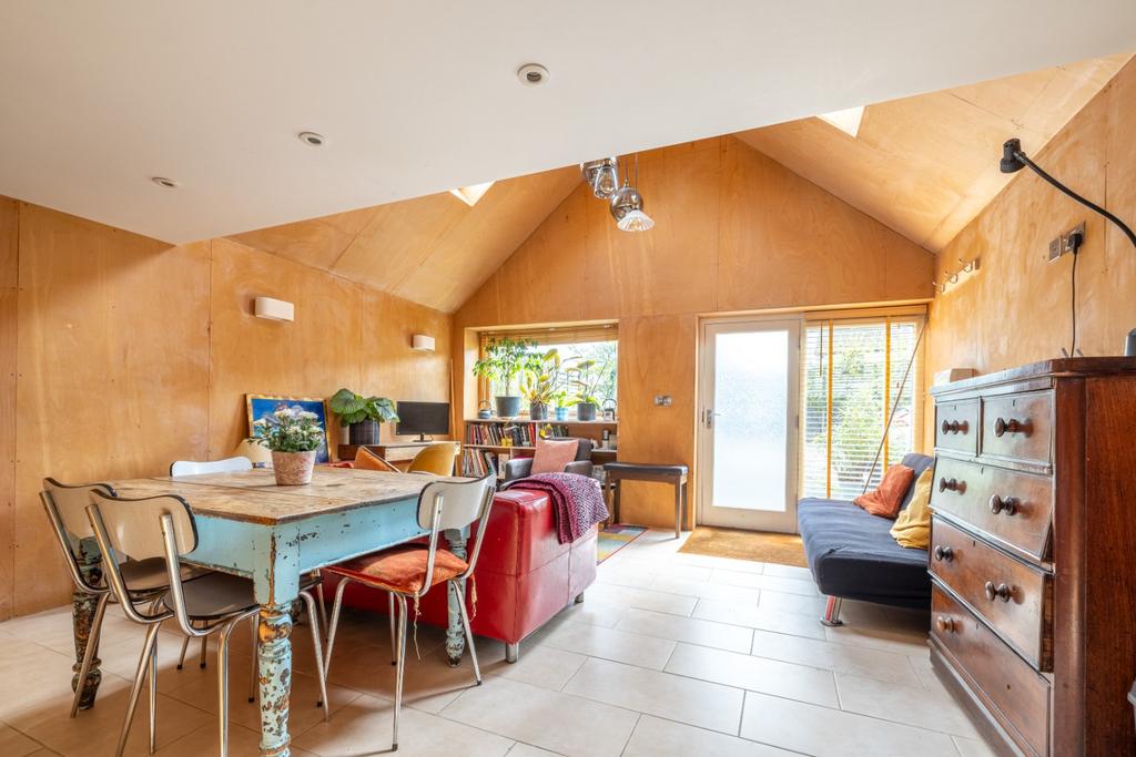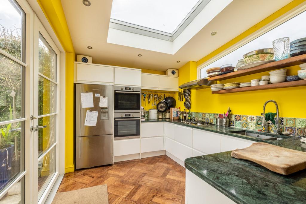 The kitchen has a dark, natural stone worksurface with sleek, white fitted units. An integrated dishwasher, 2 eyelevel ovens, gas 5 ring hob and extractor with Moroccan style tile splashback. Glazed, double exterior doors open to a private and sheltered east facing terrace which is perfect for a morning coffee. A huge roof light above the kitchen floods the area with light and throughout the ground floor, stylish clerestory windows are used to maximum effect.