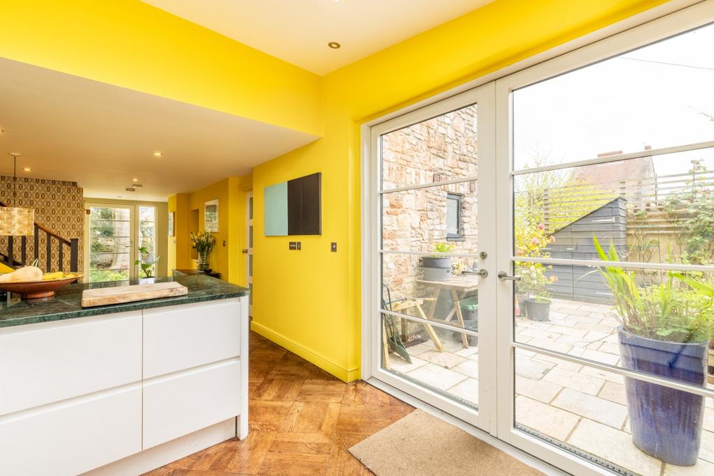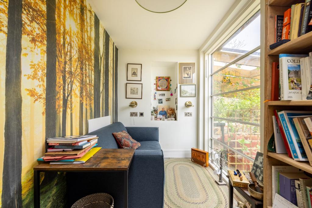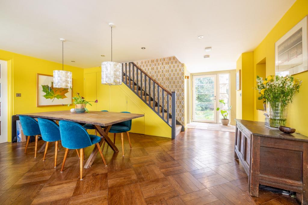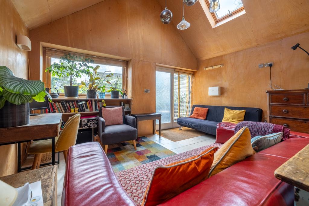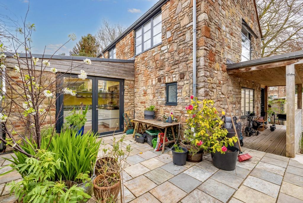 The kitchen has a dark, natural stone worksurface with sleek, white fitted units. An integrated dishwasher, 2 eyelevel ovens, gas 5 ring hob and extractor with Moroccan style tile splashback. Glazed, double exterior doors open to a private and sheltered east facing terrace which is perfect for a morning coffee. A huge roof light above the kitchen floods the area with light and throughout the ground floor, stylish clerestory windows are used to maximum effect.