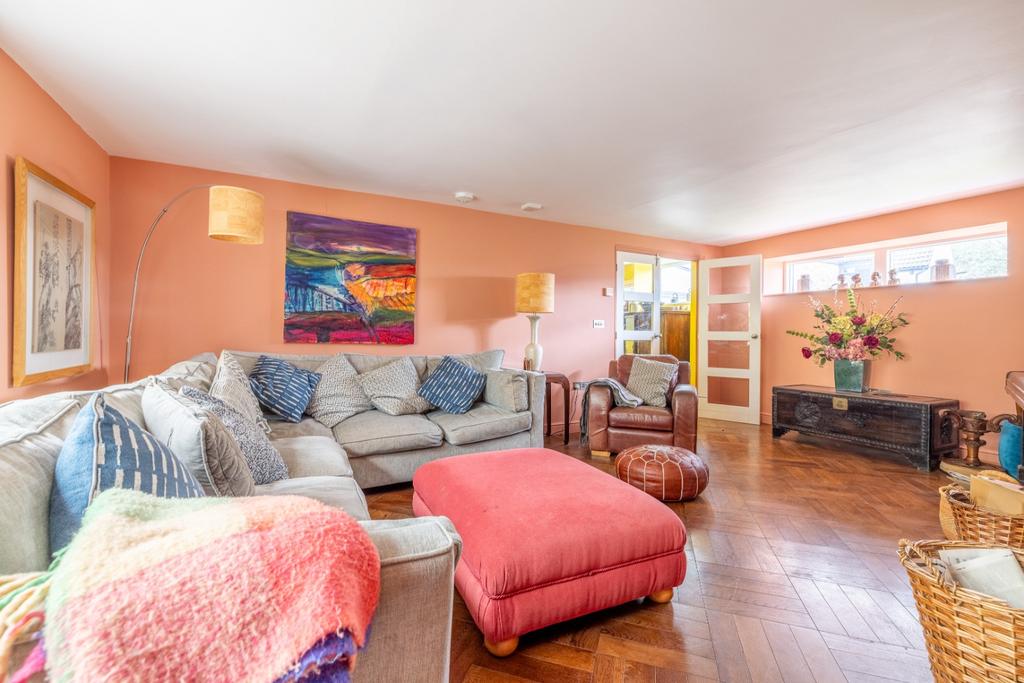 Glazed double doors lead from the dining area to the sitting room which has a dual aspect with a woodburning stove as a focal point. Beside this, in the recess, bespoke shelving creates a feature.