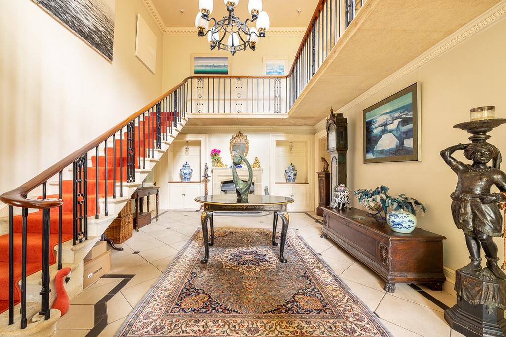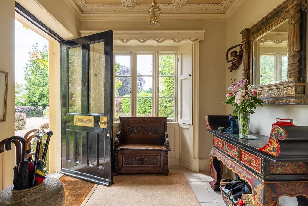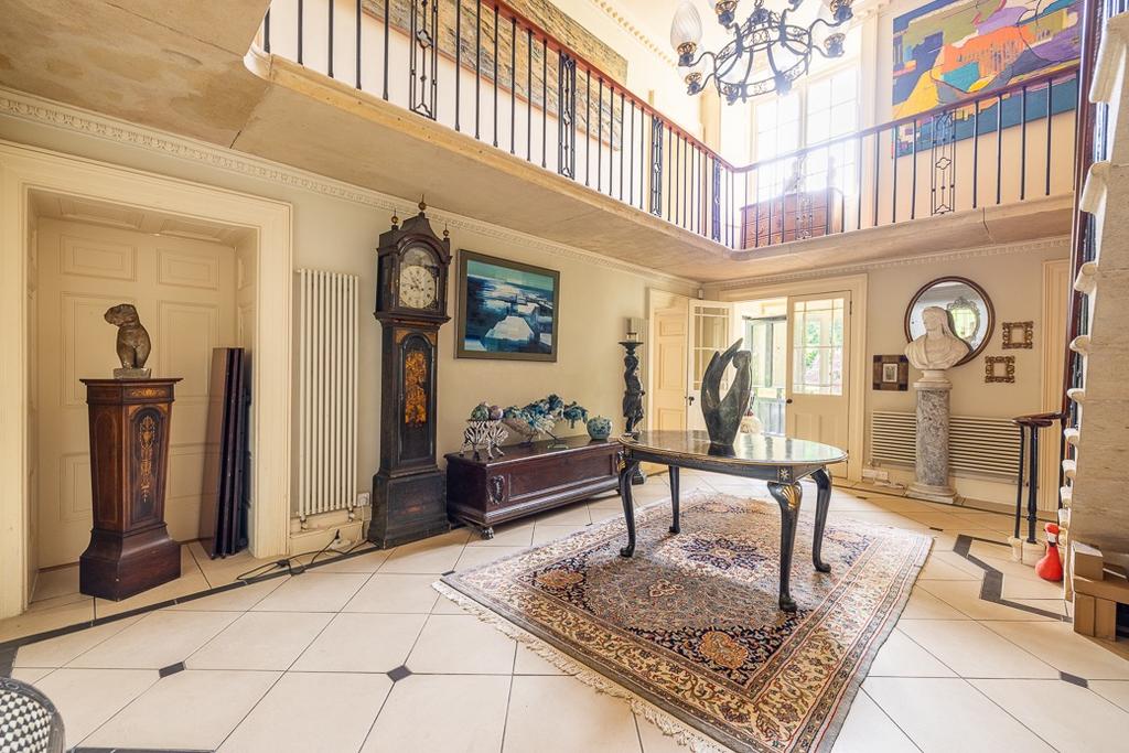 A panelled front door opens into the entrance vestibule/porch which has a tiled floor and glazed panelled double doors into the reception hall. This is a wonderful and very impressive entrance room with a splendid, cantilevered stone staircase with wrought iron balustrades and mahogany handrail. There are also alcoves, with fitted cupboards flanking the fireplace (at present not used).