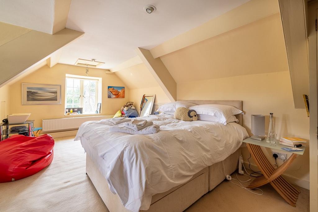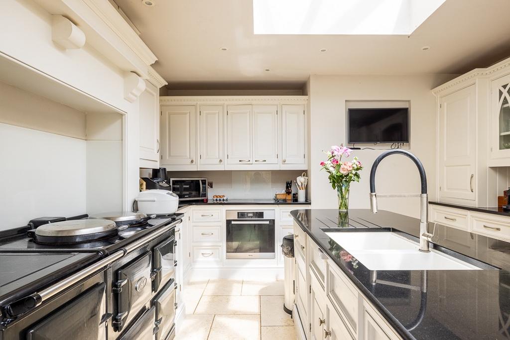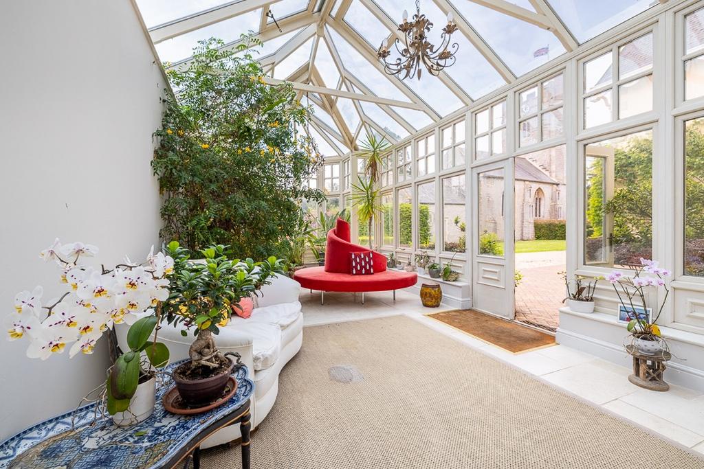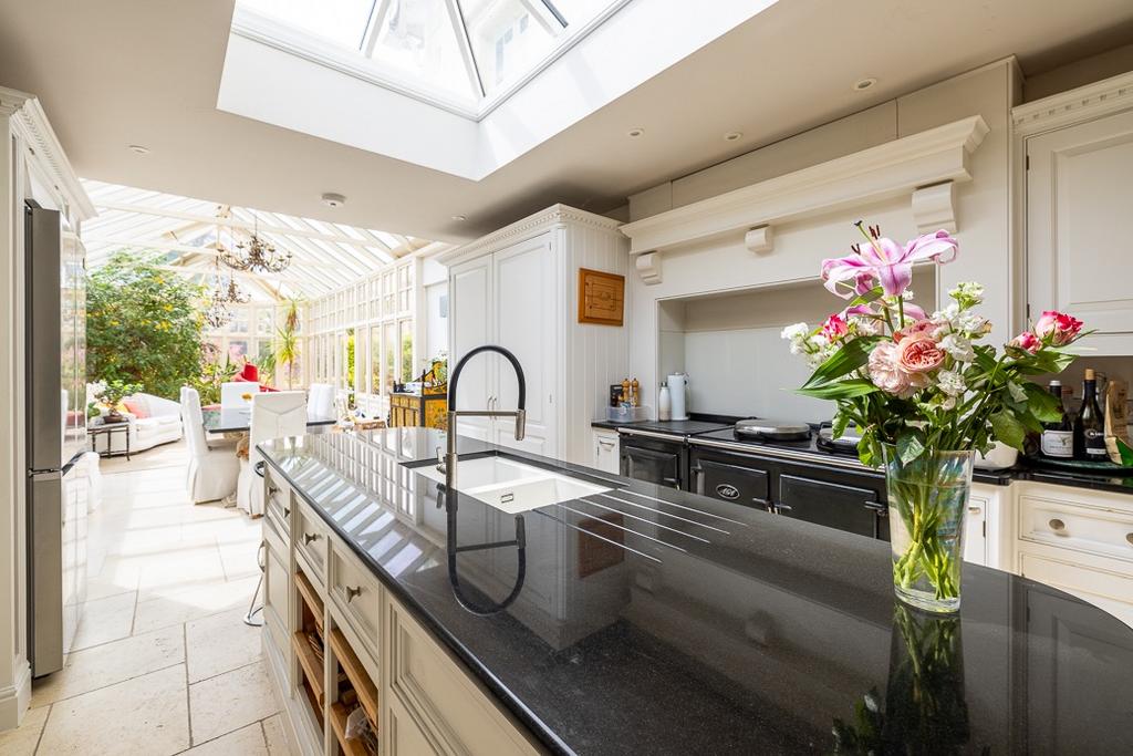 A door opens from the hall to a large and comfortable sitting room which has a log burning fireplace, recessed cupboards, French windows to the south and faces onto the garden. This room then leads into the open plan kitchen/garden room which combines the kitchen & everyday dining space. This light and magnificent entertainment space room has underfloor heating, sandstone flooring, French garden doors and views to the garden and church.