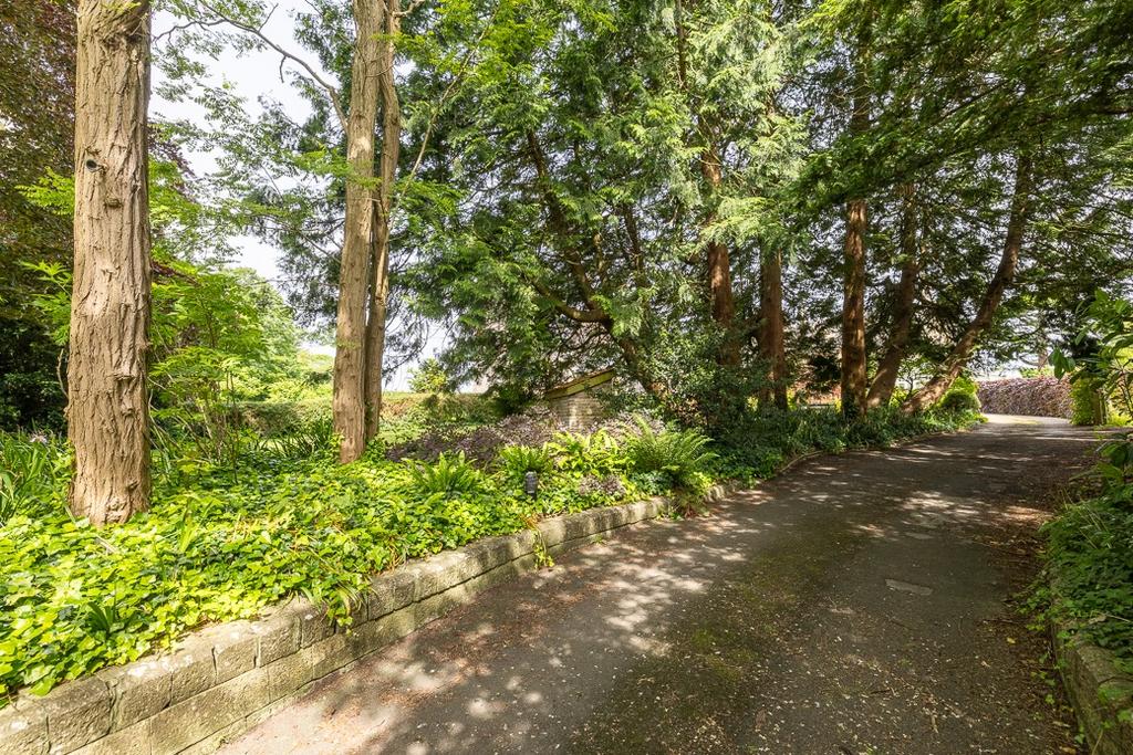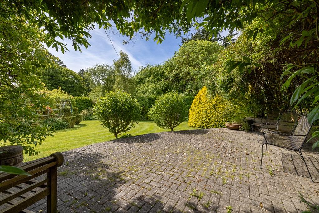 The private drive (partly shared by the adjoining house) leads to a turning circle around a pond with box hedging. To the south, there is a York stone outdoor dining area surrounded by acers and mature shrubs and then a lawned garden stretches out with mature cedar trees down to a magnificent copper beech and yew hedge. This area is bounded by a hedge to the church yard to the south and west.